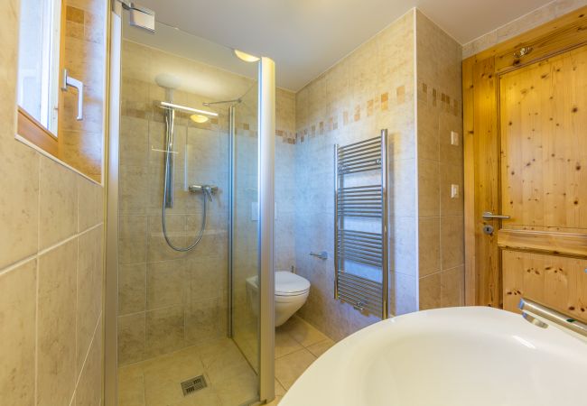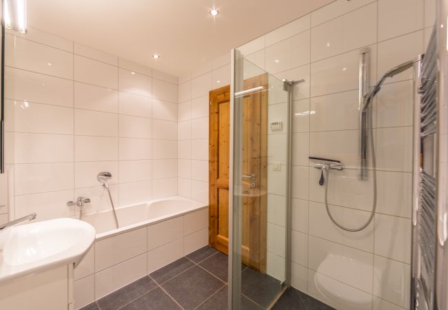 - 1 Badezimmer mit Badewanne, Dusche und WC.