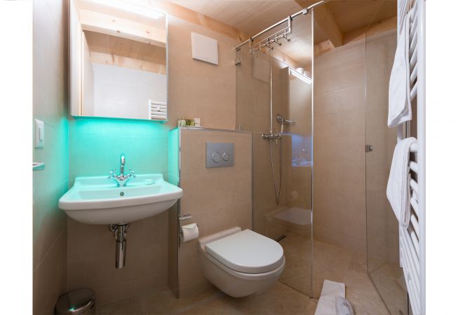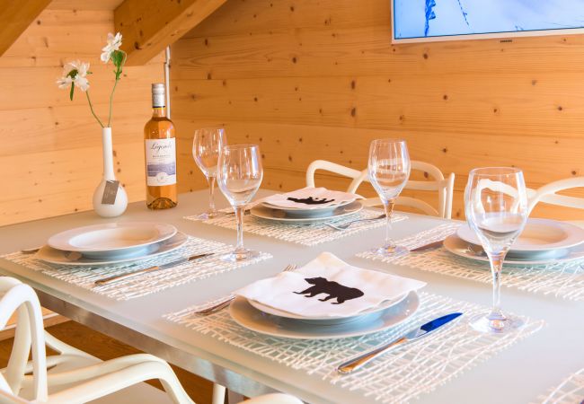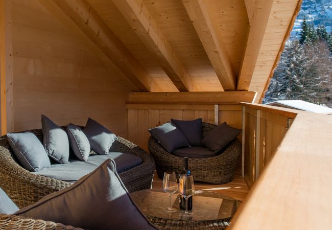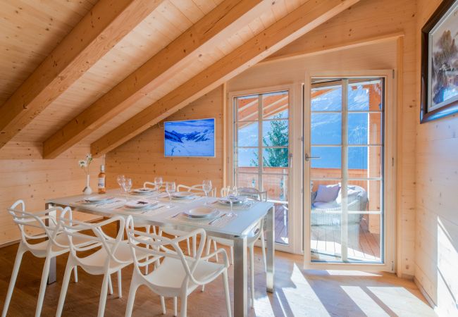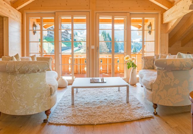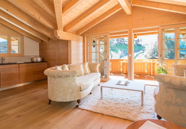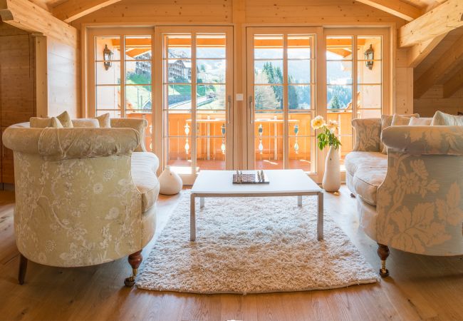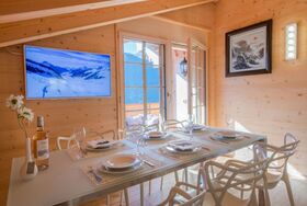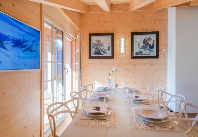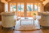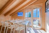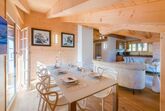 Vom Boden bis zur Decke reichende Fenster und Schiebetüren, traditionelle Holzbalken und hochwertige Möbel machen diesen alpinen Urlaubsort beeindruckend. Zwei Sofas im klassischen Stil stehen im Mittelpunkt des Wohnbereichs. Der Essbereich mit grossem Glastisch und Designerstühlen befindet sich am nächsten zum Westbalkon und eignet sich hervorragend für Unterhaltungs- oder Familienessen.
