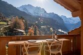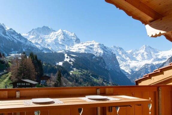 Südbalkon: Geniessen Sie das Abendessen im Freien am grossen Holztisch mit freiem Blick auf die berühmte 4000 m hohe Jungfrau und das Silberhorn. •