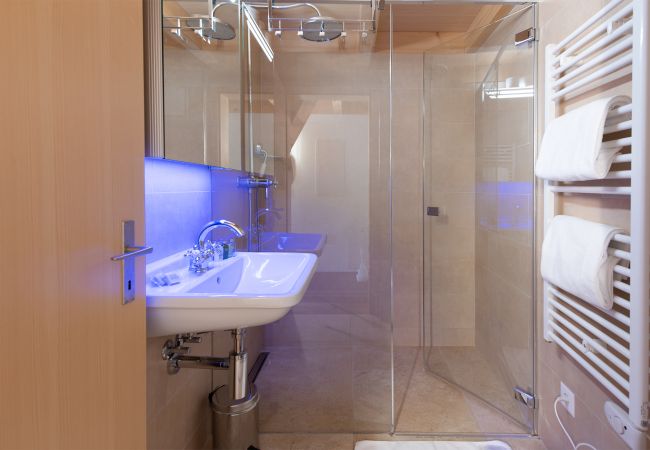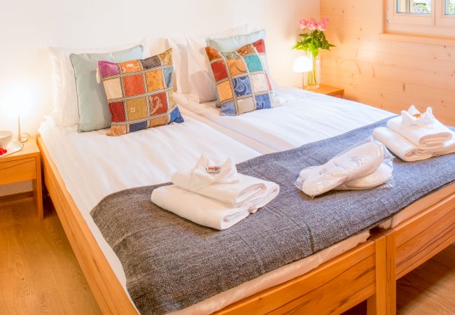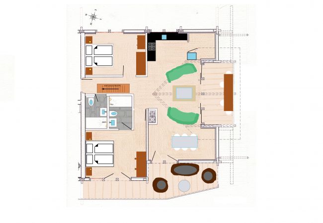 Die Wohnung mit offenem Wohnkonzept, 2 Doppelzimmern, einem 3. Galerie-Schlafzimmer und 2 Duschräumen bietet bequem Platz für bis zu 6 Personen. Das Hauptschlafzimmer mit Zugang zum nach Westen ausgerichteten Balkon ist aufwendig verarbeitet und verfügt über Fenster im klassischen Stil, ein 200 x 200 cm grosses Doppelbett und ein eigenes Bad mit ebenerdiger Dusche und WC. Das zweite Schlafzimmer bietet 2 Einzelbetten und das Schlafzimmer mit offener Galerie verfügt über ein Queensize-Doppelbett (160 x 200 cm). Es gibt ein zweites Badezimmer mit ebenerdiger Dusche und WC. Der obere Galerieraum ist über eine herunterziehbare Holztreppe zugänglich.