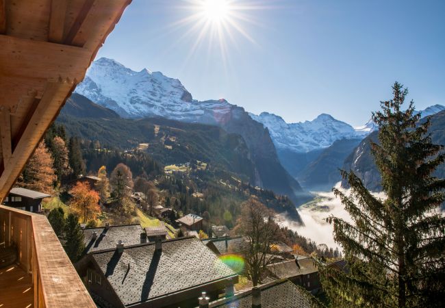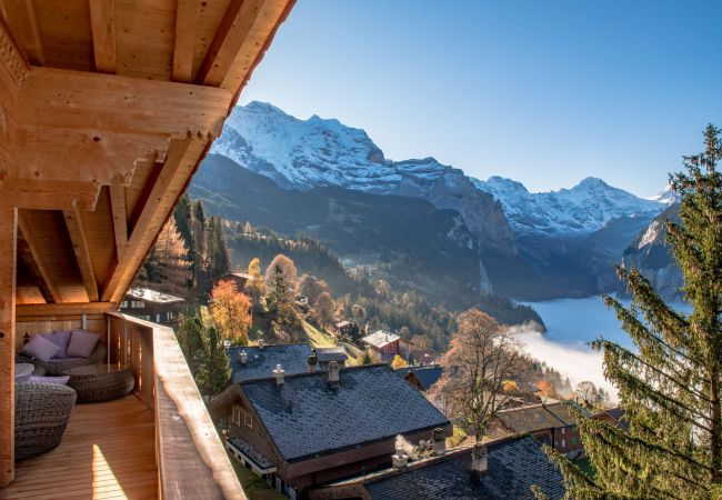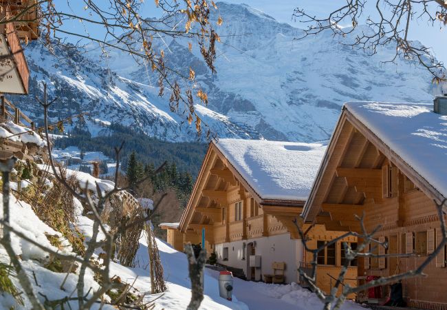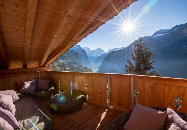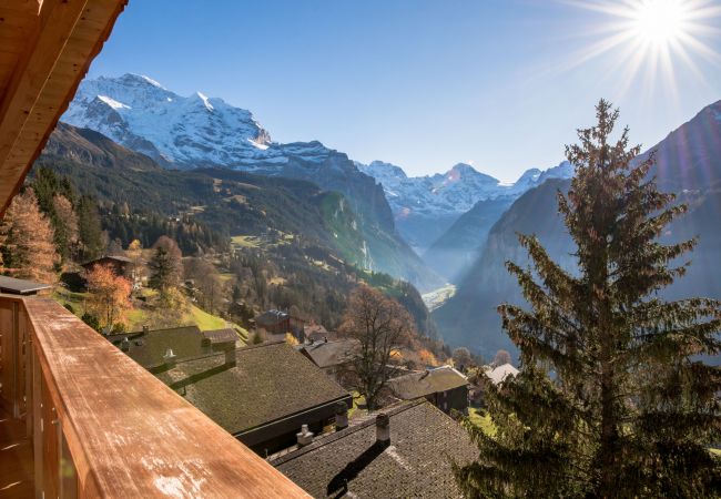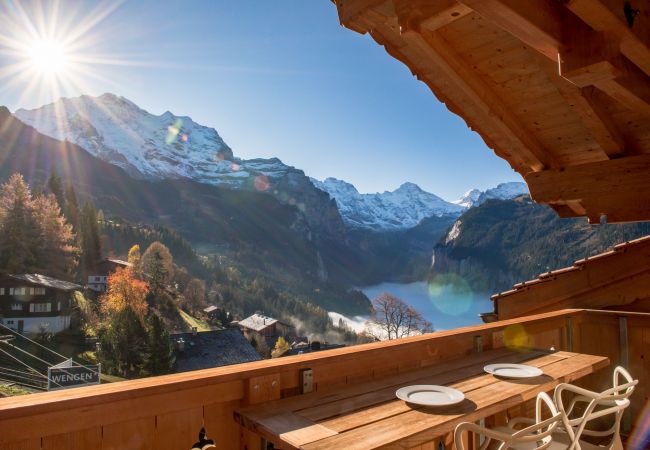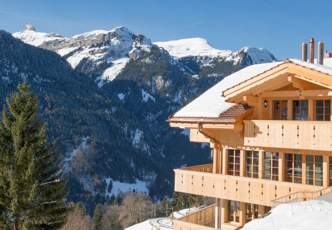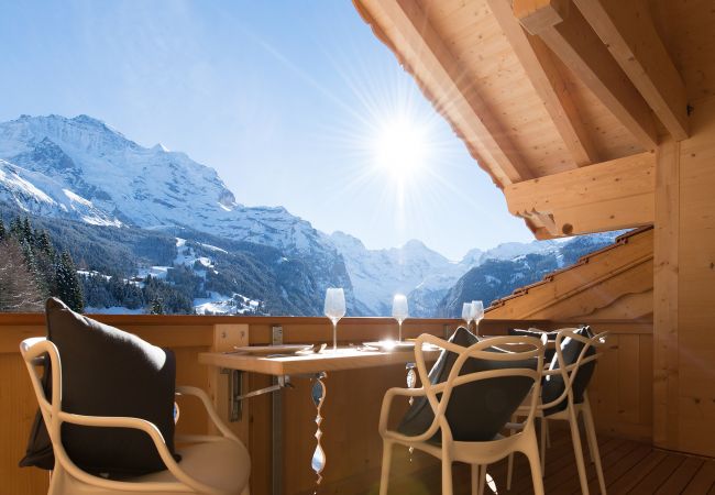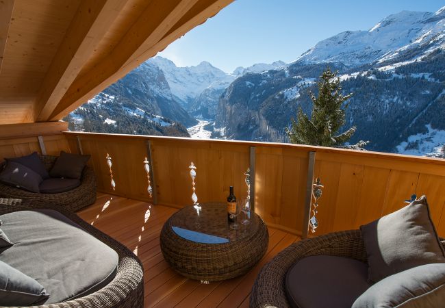 Dieses luxuriöse Penthouse im Chalet Aberot gilt als einer der besten Ferienwohnungen in Wengen mit herrlichem Blick auf das Lauterbrunnental, den berühmten Jungfrau-Gipfel und die umliegenden Berge. Das Chalet wurde 2013 im traditionellen Stil mit einem sehr hohen Standard erbaut und befindet sich auf einem nach Süden ausgerichteten Felsvorsprung direkt unterhalb des Dorfes und 350 m vom Bahnhof, der Hauptstrasse des Dorfes und den Skipisten entfernt. Wengen hat ein autofreies Dorf und hat keine Zufahrtsstrasse und ist nur mit dem Zug ab Lauterbrunnen erreichbar.