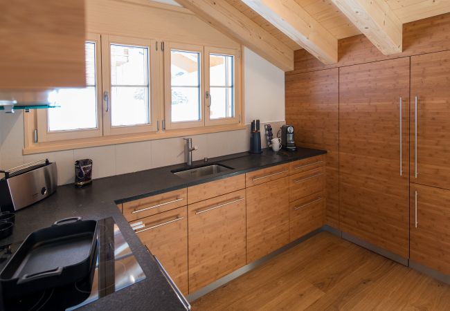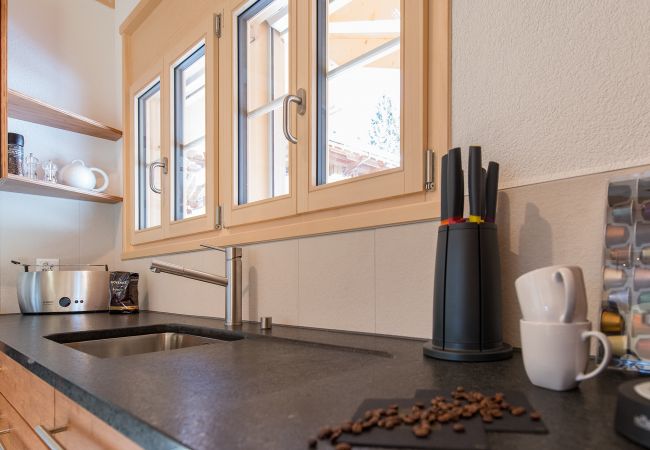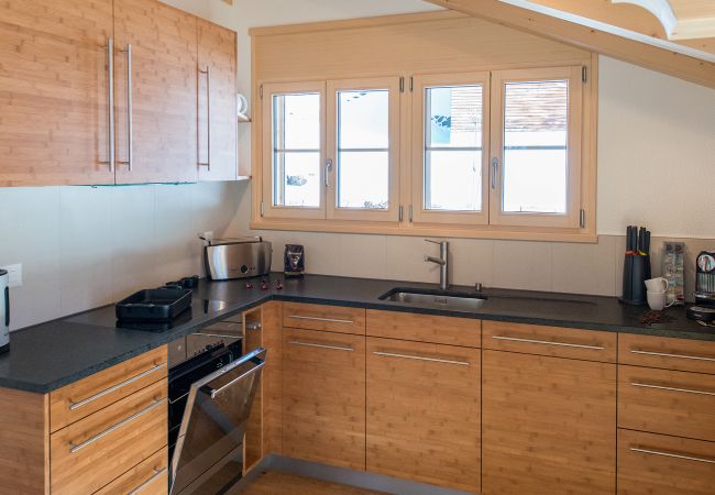 Die Küche ist voll ausgestattet für Selbstversorger mit Backofen, Keramikkochfeld, Kühlschrank, Mikrowelle, Nespresso-Kaffeemaschine, Dampfgarer, Wasserkocher, Toaster und dem wichtigen Fondue-Set.