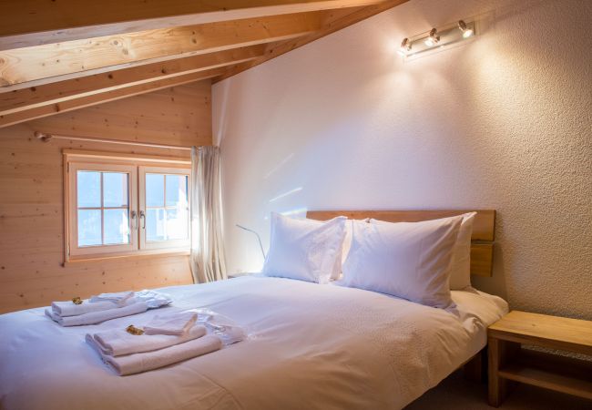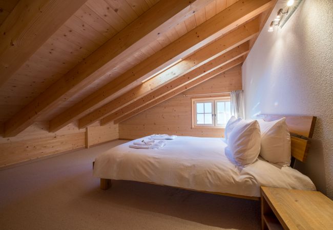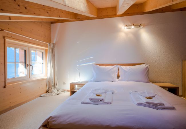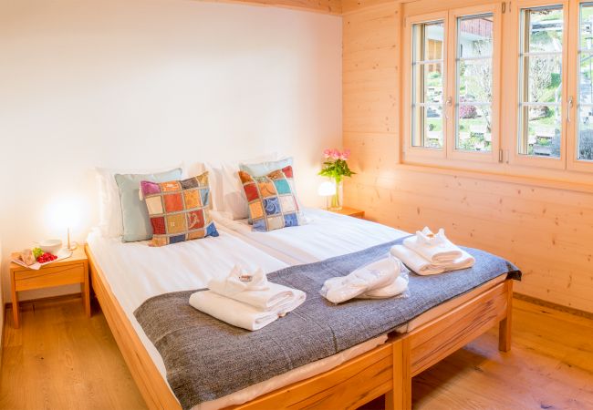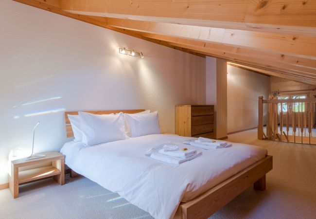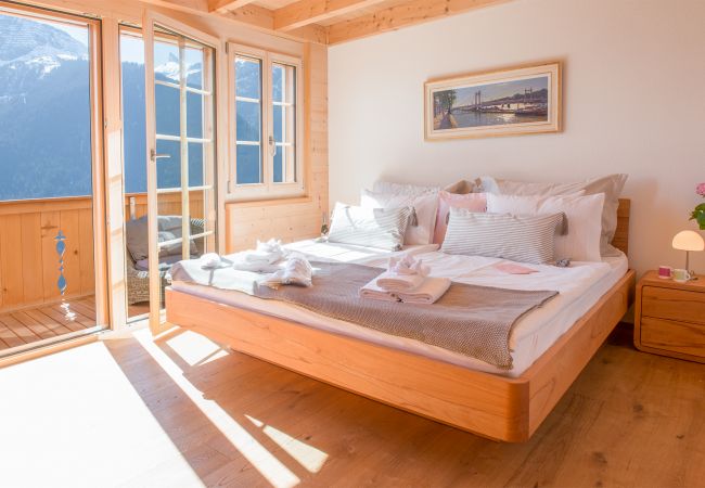 Hauptschlafzimmer: Dieses Schlafzimmer bietet Zugang zum grossen, nach Westen ausgerichteten Holzbalkon mit freiem Blick und verfügt über ein extra grosses Doppelbett (200 x 200 cm) in einem handgefertigten Schweizer Holzrahmen, passende Schubladen, handgefertigte Nachttische, Regale und Originalgemälde aus Japan und Grossbritannien. •