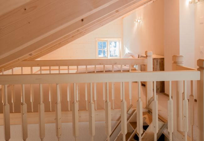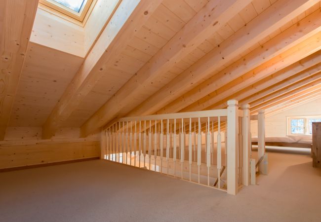 Galerie: Der grosse Galerieraum ist über eine herunterziehbare Holztreppe erreichbar und bietet einen separaten Schlafbereich mit Doppelbett (140x200cm) für 2 weitere Gäste. •