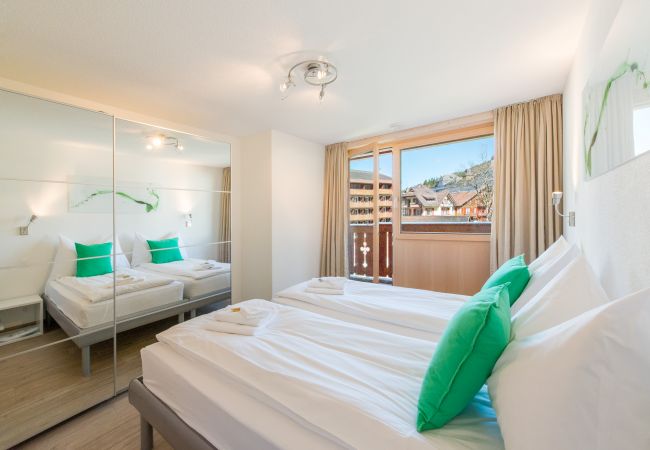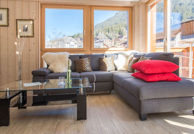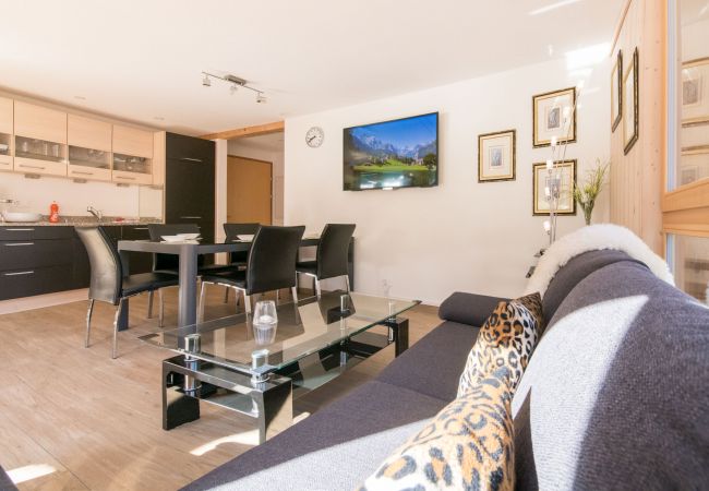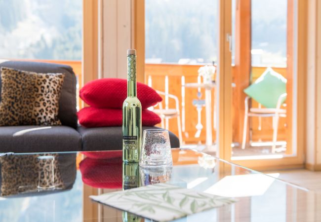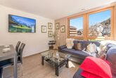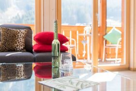 • Der Wohnbereich ist ausgestattet mit: komfortablem Kunstledersofa, Couchtisch, Flachbildfernseher, modernem Fliesenboden und großen Panoramafenstern mit Blick auf den Männlichen und den Wengener Anfängerhügel sowie auf den Minigolfplatz.