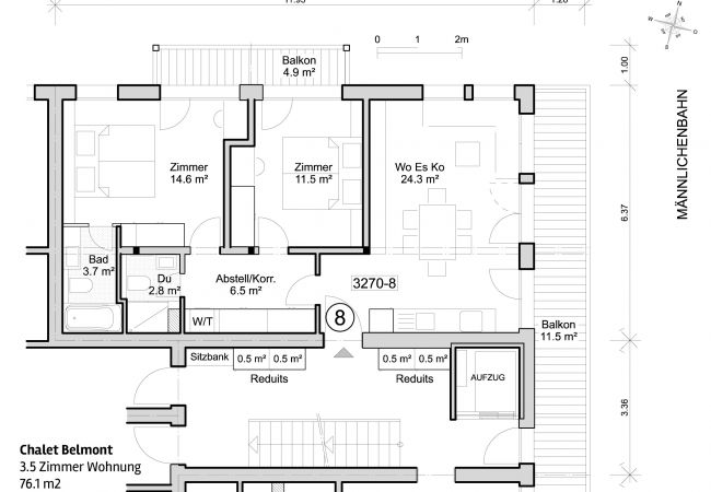 • Der Ostbalkon hat Zugang vom Wohnbereich aus durch bodentiefe Balkontüren und bietet Aussicht auf den Männlichen, die Skipisten und den Minigolfplatz. Er ist mit Gasgrill, Tisch und Stühlen ausgestattet.