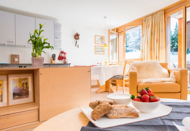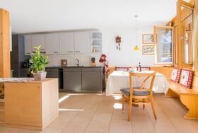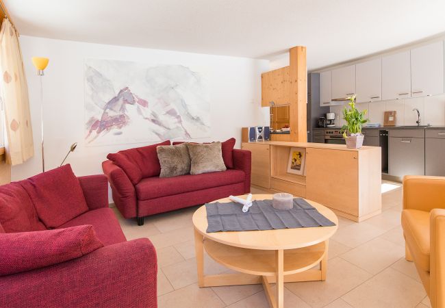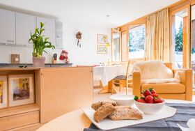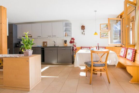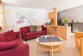 Der grosszügige, offene Wohn-Essbereich mit 2 Sofas und einem Armlehnstuhl offnet sich auf den Südbalkon mit Blick auf die Skipiste und die umliegenden Berge. Neben die Küche befindet sich eine aus Holz gemachte Essecke welche für Familie Mahlzeiten bestens geeignet ist – oder – entspannen Sie sich mit Kabelfernsehen und Wifi nach einer Mahlzeit auswärts in einer die nahliegenden Restaurants.