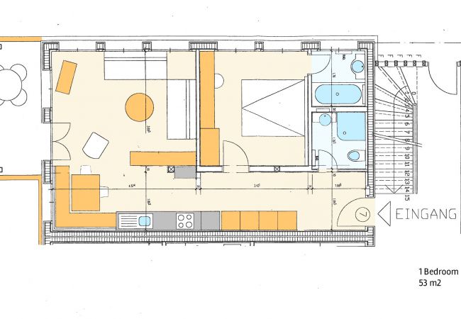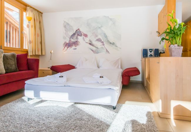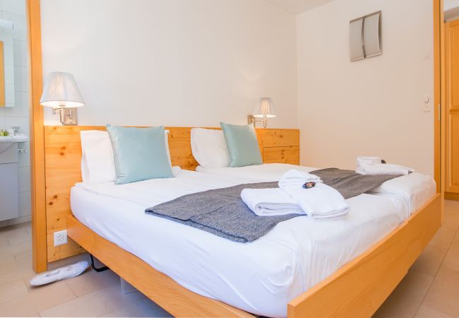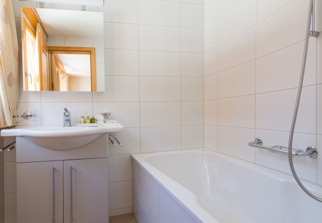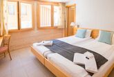 Das geräumige Schlafzimmer mit Kingsize-Bett (180x200cm) verfügt über ein eigenes Badezimmer mit Badewanne und Waschbecken. Zwei weitere Gäste haben Platz auf dem Sofabett (160x200cm) im Wohnzimmer. Zweckmässig hat die Ferienwohnung ein weiterer Duschraum mit Dusche, Waschbecken und Toilette.