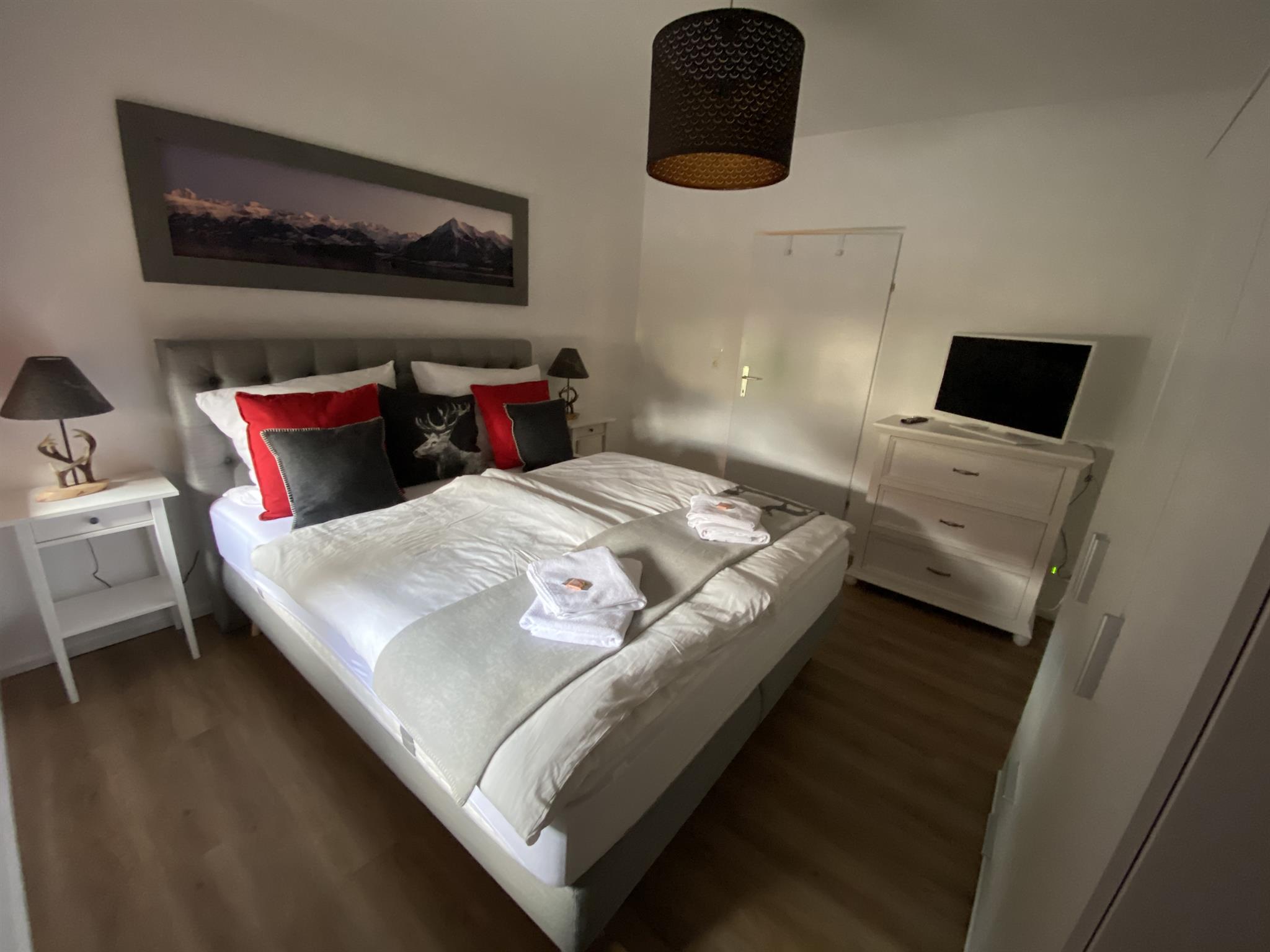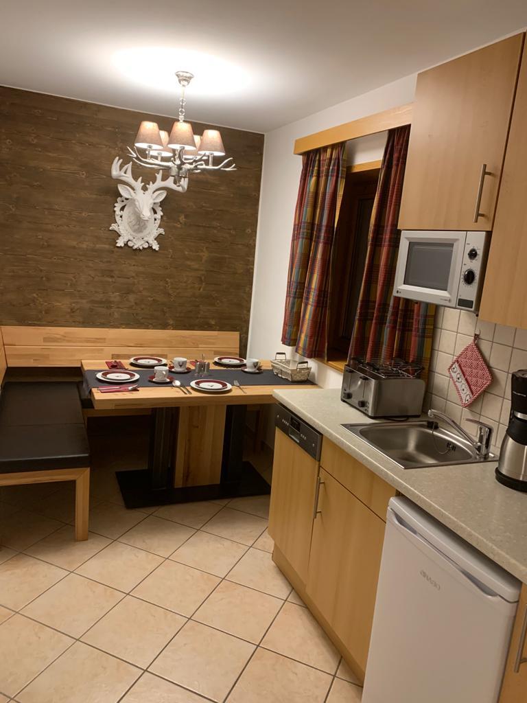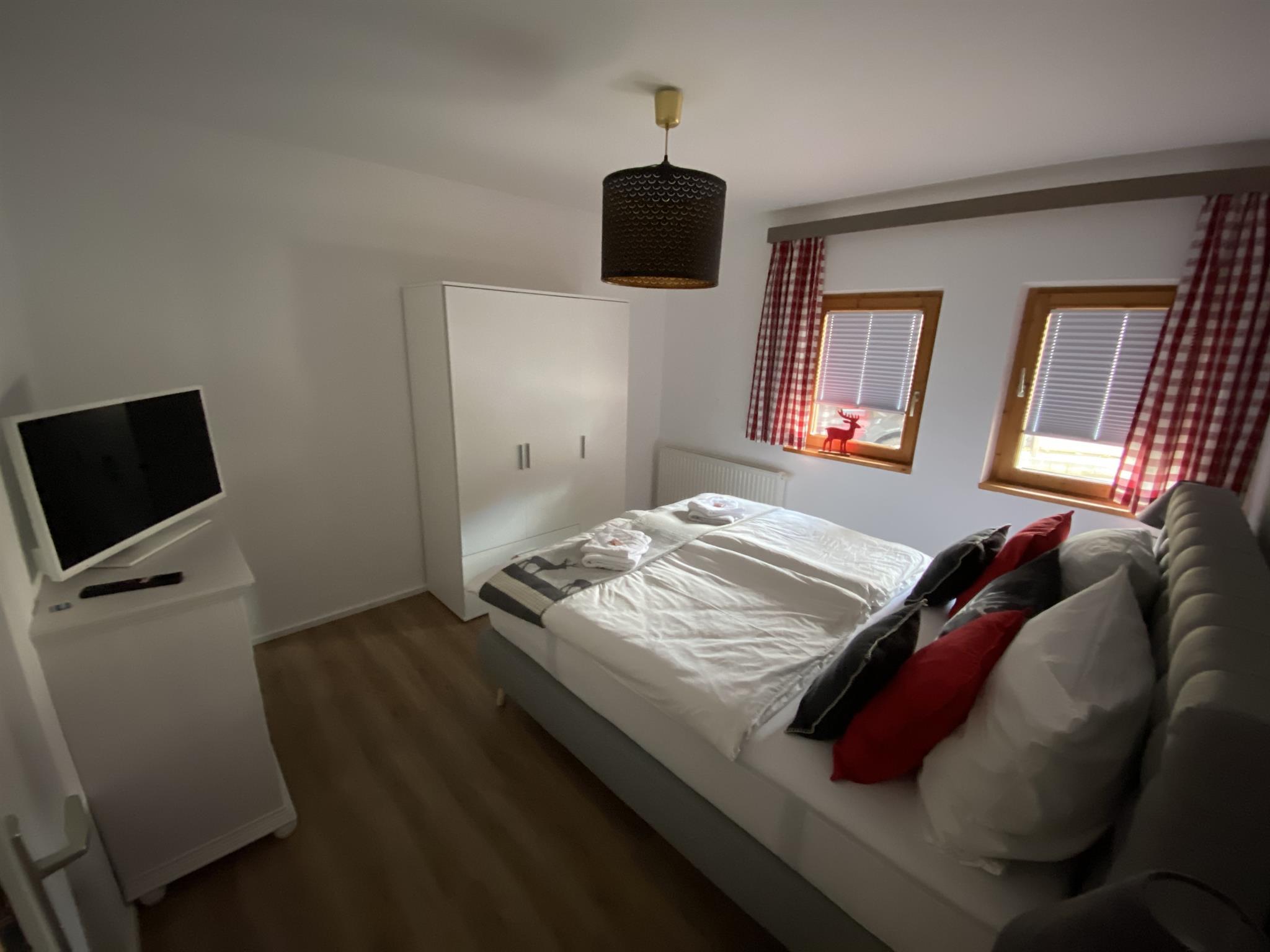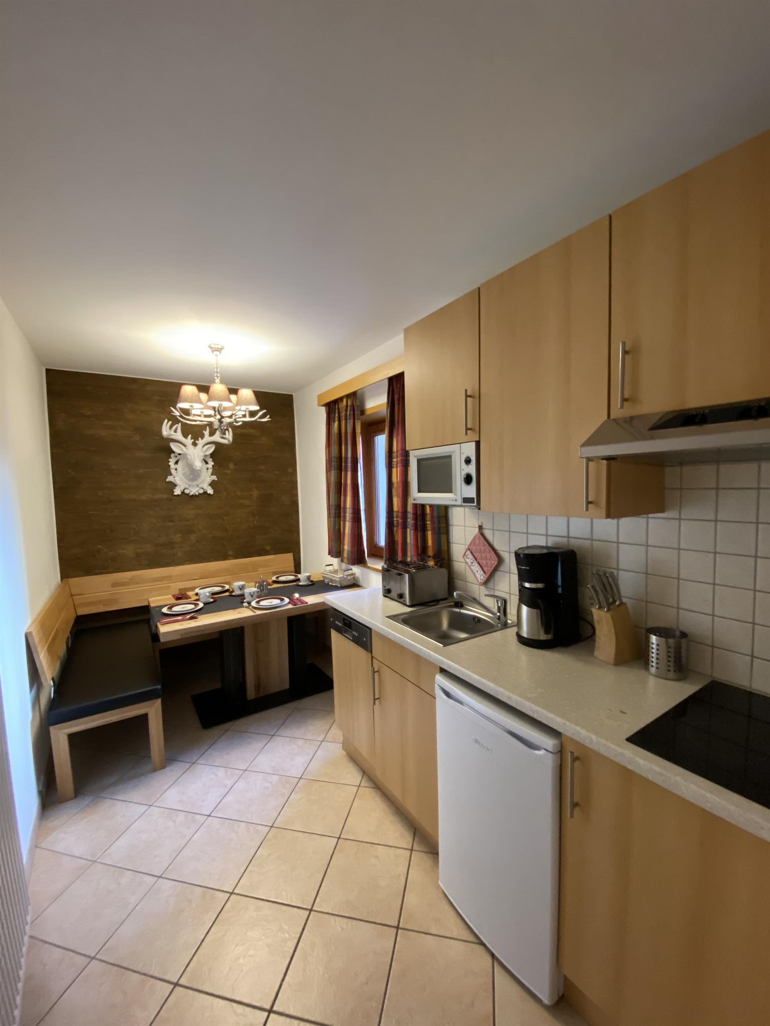 Das Appartement mit 55 qm ist eingerichtet mit 2 Schlafzimmer(Doppelbett), eine Küche, mit Essbereich, Kochherd, Kaffeemaschine, Spülmaschine, Mikrowelle, Kühlschrank,Dusche, Wachbecken, WC, Parkplätze mit Carport.