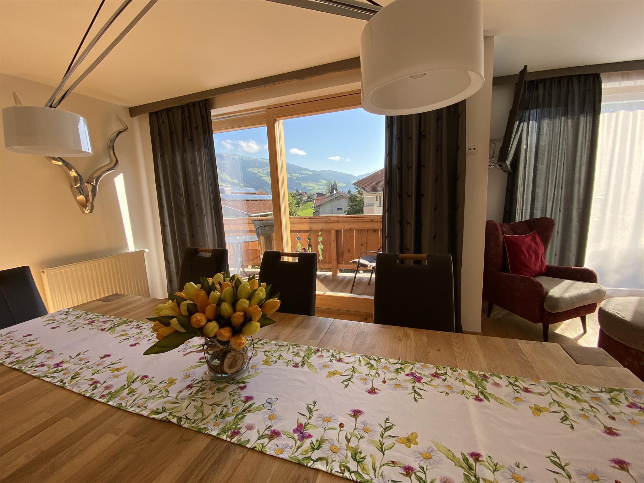 Vom schönen Balkon aus genießen Sie eine fantastische Berg Aussicht. Der Skibus hält fast vor der Tür und bringt Sie innerhalb weniger Minuten in eines der größten Skigebiete Österreichs! Hinter dem Haus gibt es noch eine zusätzliche Terrasse und Sie verfügen über einen eigenen Garten mit Terrassenmöbeln. Alles in allem ein fantastisches Luxus Ferienhaus für alle.