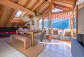 Die offene Wohn-Ess-Küche hat alles, was man sich wünscht: eine Holzbalkendecke im Chalet-Stil, einen skandinavischen Holzofen, Möbel im alpinen Chalet-Stil, Panoramafenster und -türen, die vom Boden bis zur Decke reichen, einen Westbalkon, auf dem Sie im Freien speisen können, und eine Aussicht, die zum Sterben schön ist.