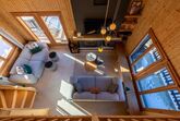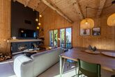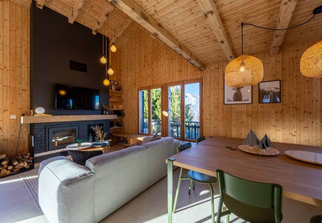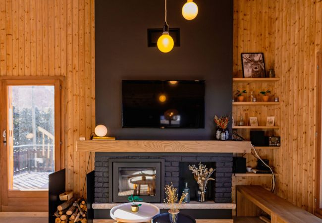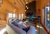 Gemütliches Wohnzimmer mit Kabelfernsehen, Kamin und Blick auf die Alpen.