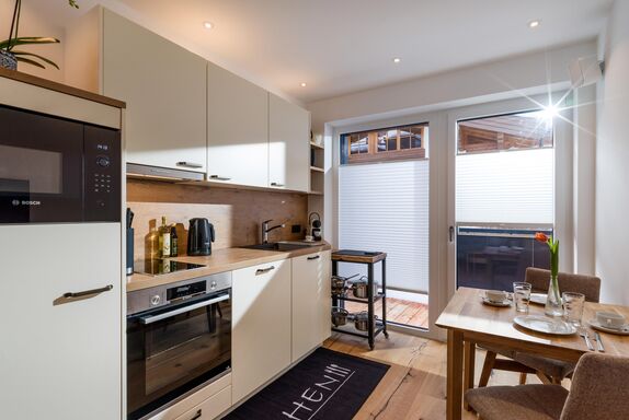 Küchenzeile mit Elektrogeräten. Kochgeschirr/Besteck und Kochutensilien, Kaffee, Tee und Gewürzen sind vorhanden. Der Wohnbereich verfügt über eine Couch, SAT TV, WLAN.