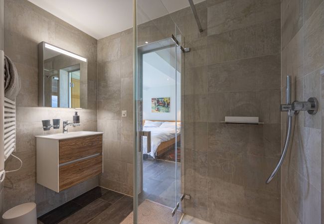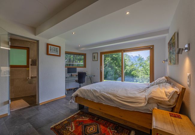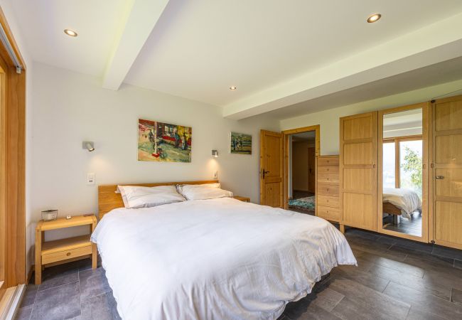 4 grosse Schlafzimmer, davon 3 Schlafzimmer mit Doppelbett. Das Elternschlafzimmer verfügt über ein eigenes Badezimmer und einen eigenen Arbeitsbereich. Drei der Schlafzimmer haben eine aussergewöhnliche Aussicht, eines mit Balkon die anderen beiden mit Glasschiebetüren, die vom Boden bis zur Decke reichen. 1 Kinderzimmer mit Etagenbett + 1 Einzelbett und einem Ausziehbett.