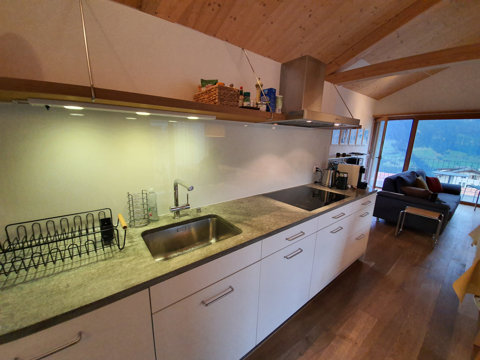 Offene Küche im OG mit angrenzendem Essbereich, ausgestattet mit Backofen mit integrierter Mikrowelle, Geschirrspüler, Kaffeemaschine (Delizio). Badezimmer: