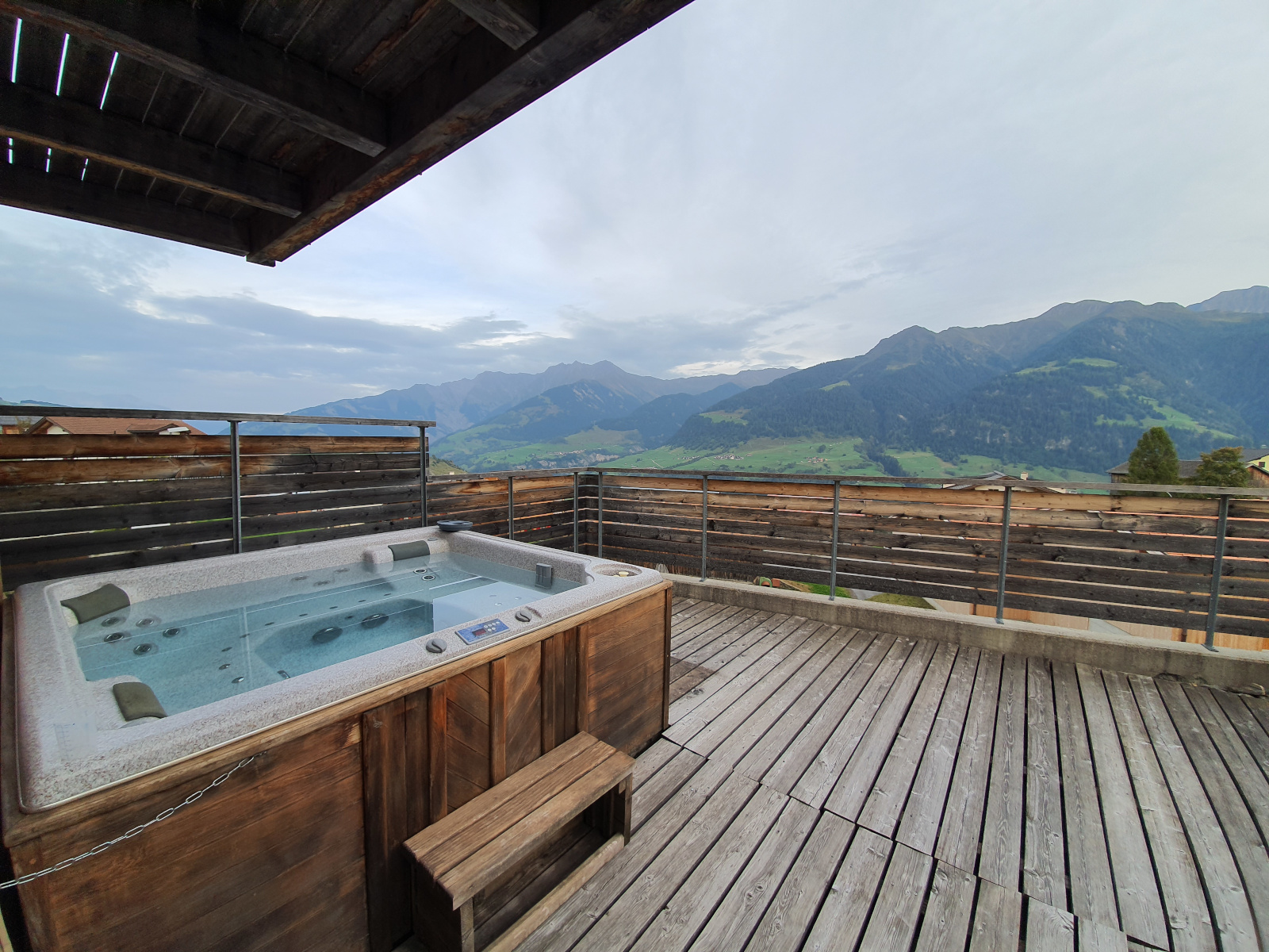 Terrasse mit traumhafter Bergsicht und Whirlpool (50 CHF Unkostenbeitrag), sowie zusätzlichem Balkon und gedecktem Sitzplatz.