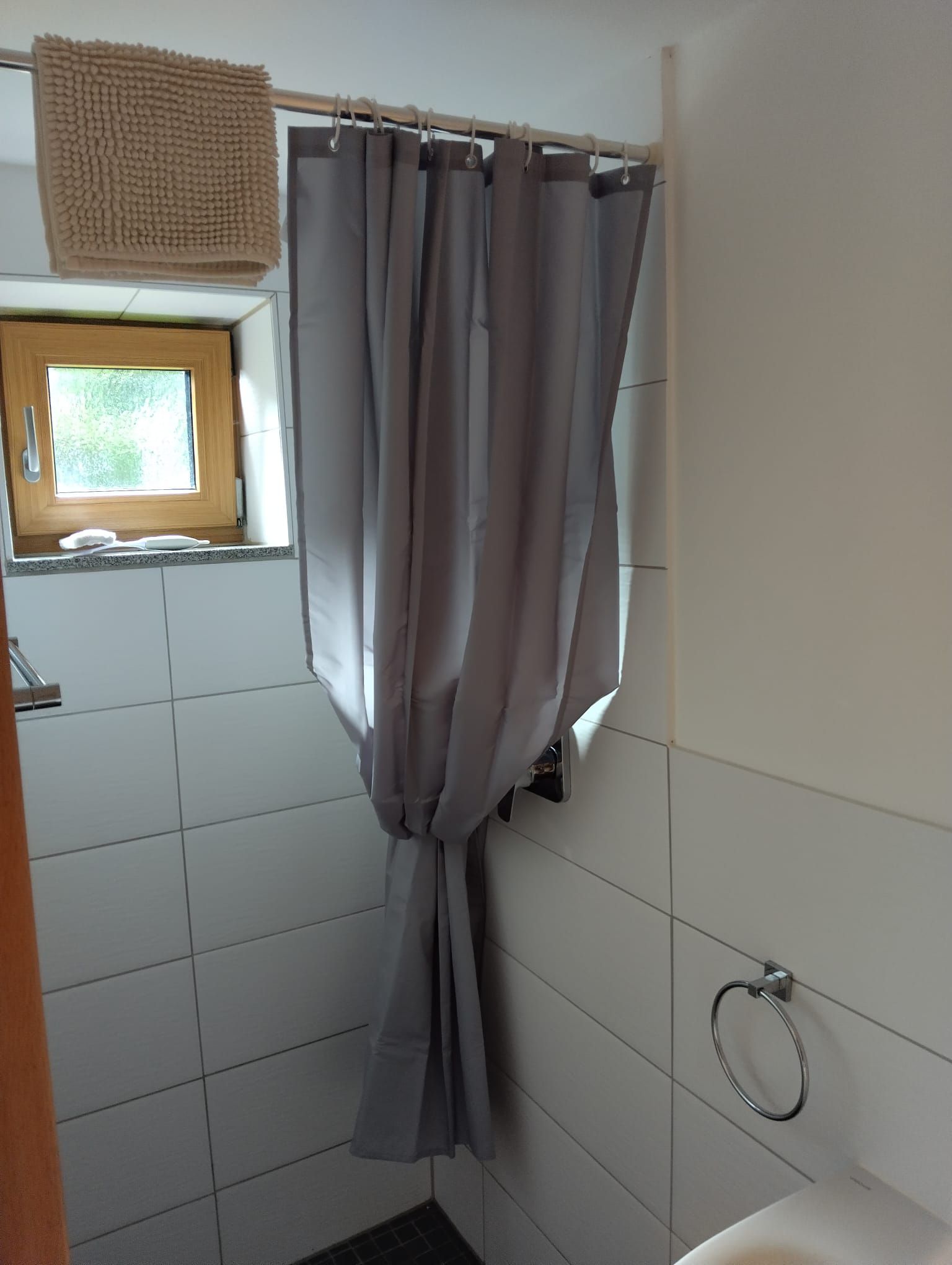 Davon durch einen Raumteiler abgetrennt befindet sich der Schlafbereich im hinteren Teil bestehend aus einem Bett (120x200cm) und Schrank. Von hier aus gelangt man das in das separate Badezimmer, in welchem sich eine ebenerdige Dusche, WC und Waschbecken befindet. Handtücher, Seife und Toilettenpapier sind vorhanden.