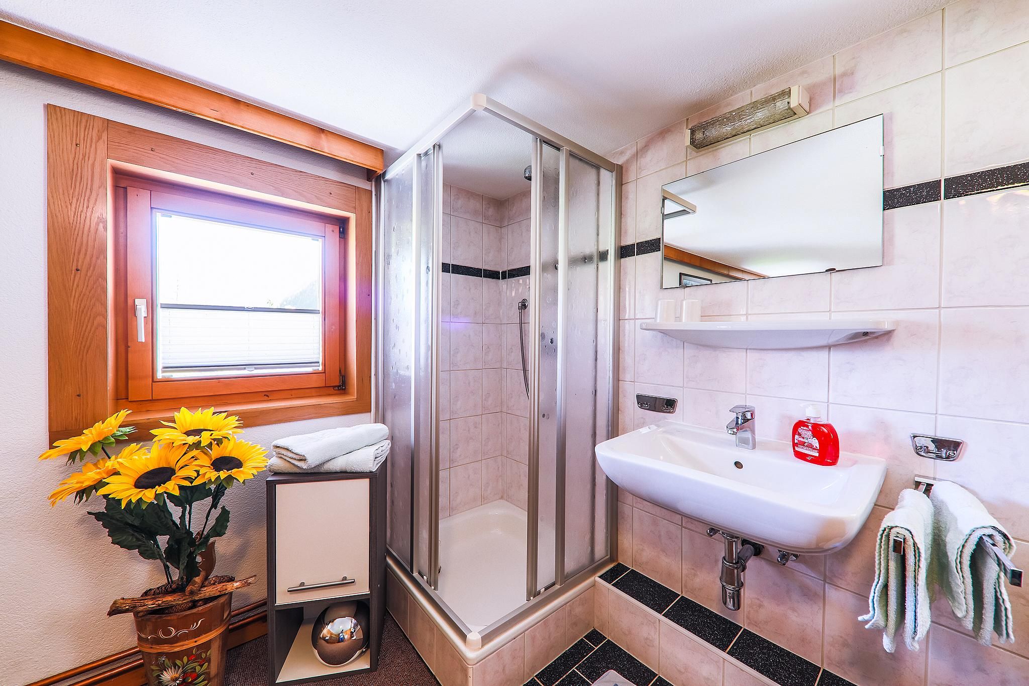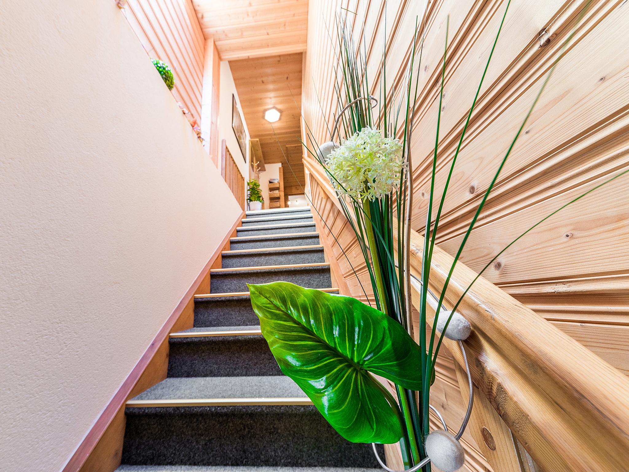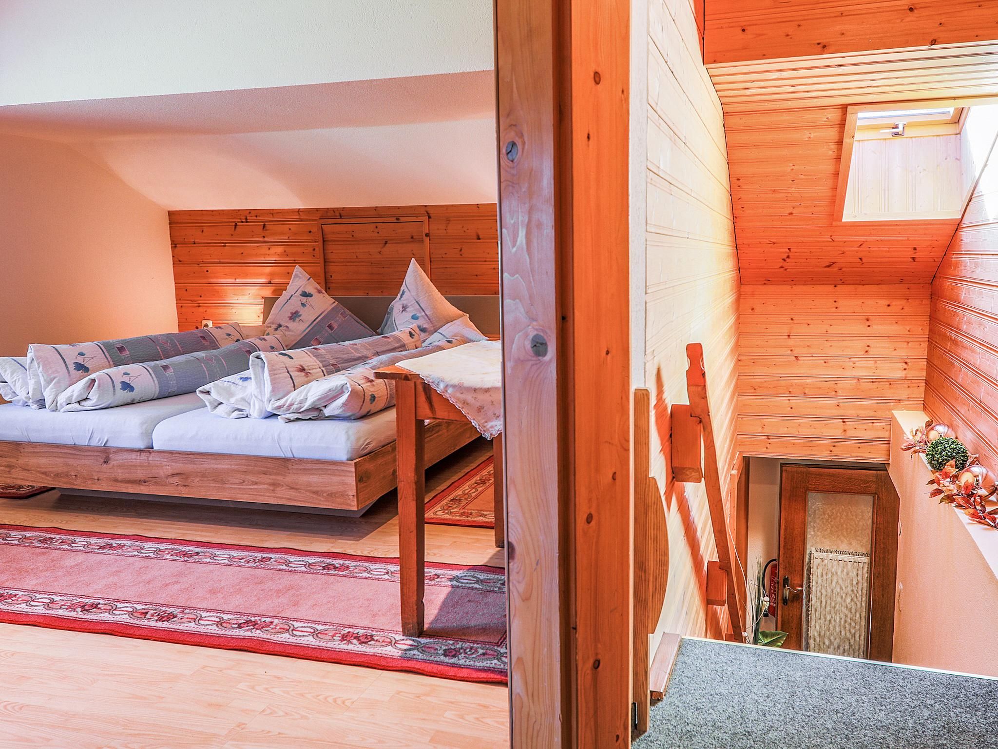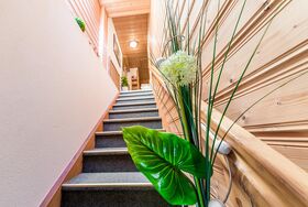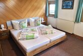 Unsere 65 m² große Ferienwohnung, mit eigenem Eingang, erstreckt sich über 2 Etagen und besteht aus 1 Doppelzimmer mit Dusche/WC und einer interen Treppe in die zweite Etage. Oben befinden sich Diele mit Garderobe, Wohnraum mit Sitzgruppe, Sat-TV, Radio, Küche (4 Plattenherd, Backofen, Dunstabzug, Kaffeemaschine, Microwelle) mit Essecke und Dachfenster, Schlafzimmer mit Doppelbett, Dusche/WC und großer, möblierter Südbalkon.