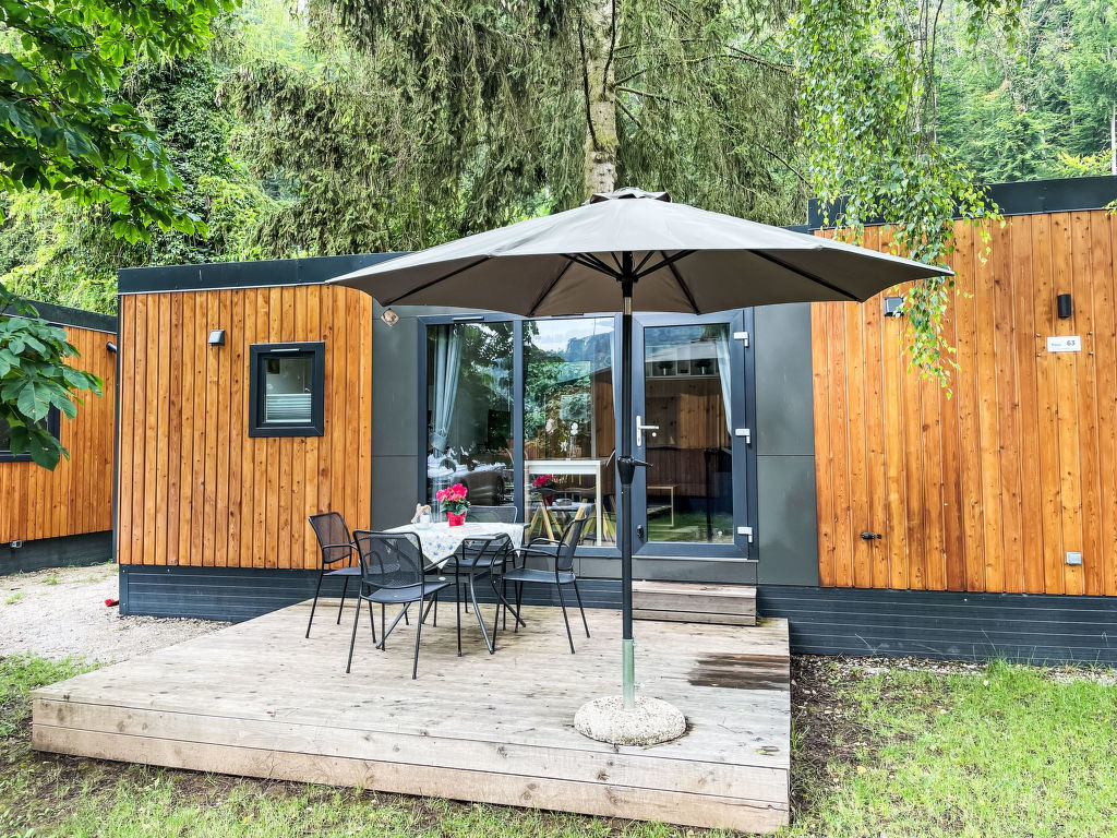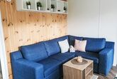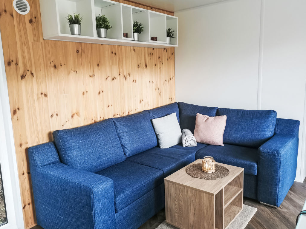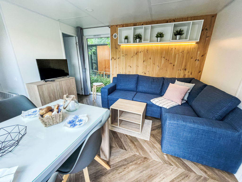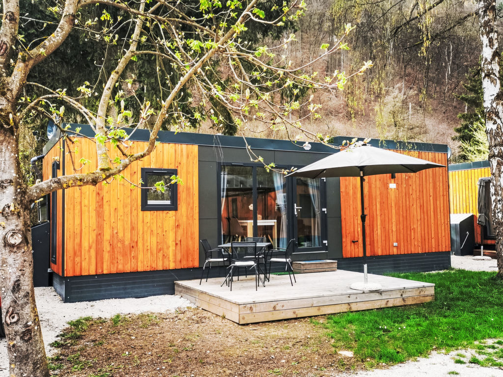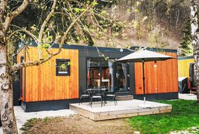 Tiny Haus Birkenlodge, 3-Zimmer-Mobilheim 32 m2. Gemütlich eingerichtet: Wohn-/Schlafzimmer mit (120 cm, Länge 170 cm), Sat-TV. Ausgang zur Terrasse. 1 Zimmer mit 1 franz. Bett (140 cm, Länge 200 cm). 1 Zimmer mit 2 Betten (80 cm, Länge 200 cm). Offene Küche (4 Glaskeramikplatten, Wasserkocher, elektrische Kaffeemaschine). Dusche/WC. E-Heizung. Kleine Terrasse. Terrassenmöbel. Parkplatz in 30 m. Bitte beachten: Nichtraucher-Haus.