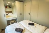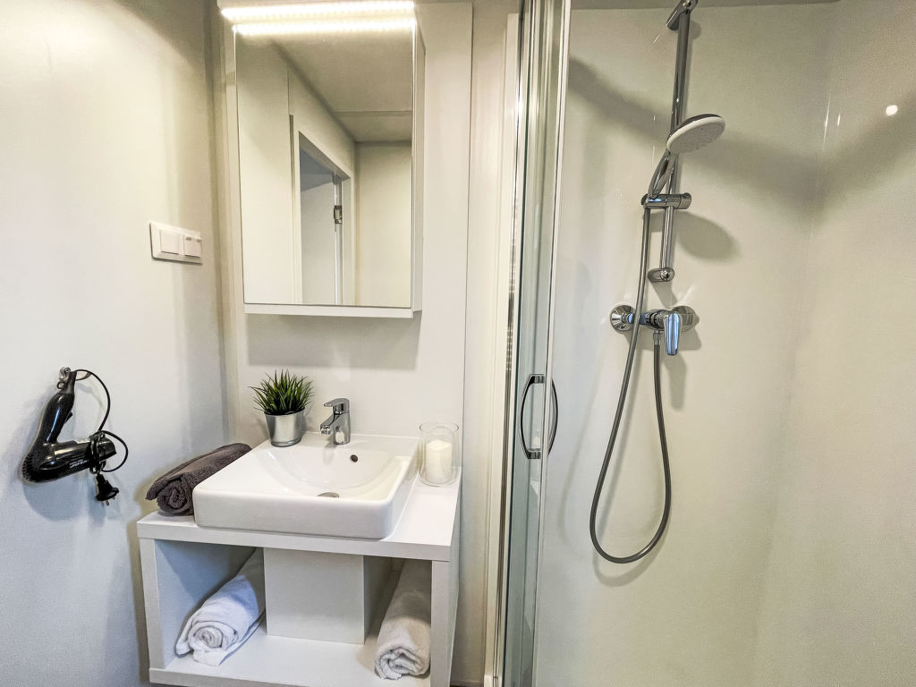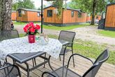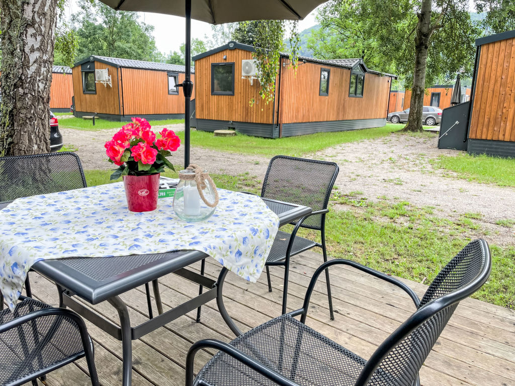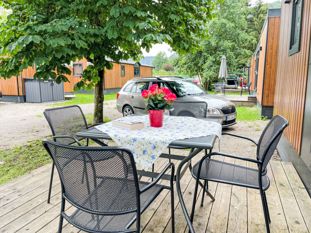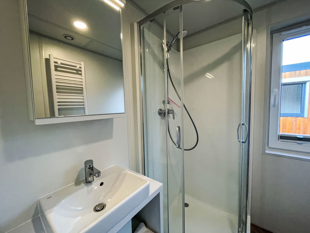 Tiny Haus Birkenlodge, 3-Zimmer-Mobilheim 32 m2. Gemütlich eingerichtet: Wohn-/Schlafzimmer mit (120 cm, Länge 170 cm), Sat-TV. Ausgang zur Terrasse. 1 Zimmer mit 1 franz. Bett (140 cm, Länge 200 cm). 1 Zimmer mit 2 Betten (80 cm, Länge 200 cm). Offene Küche (4 Glaskeramikplatten, Wasserkocher, elektrische Kaffeemaschine). Dusche/WC. E-Heizung. Kleine Terrasse. Terrassenmöbel. Parkplatz in 30 m. Bitte beachten: Nichtraucher-Haus.