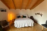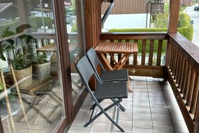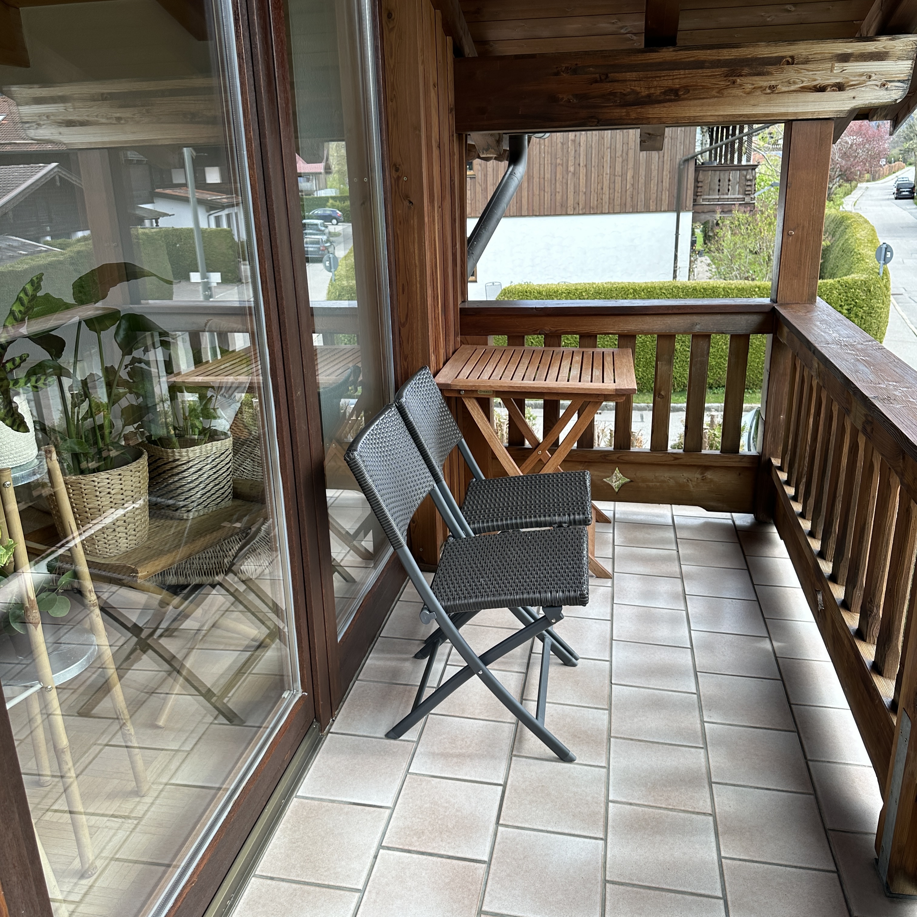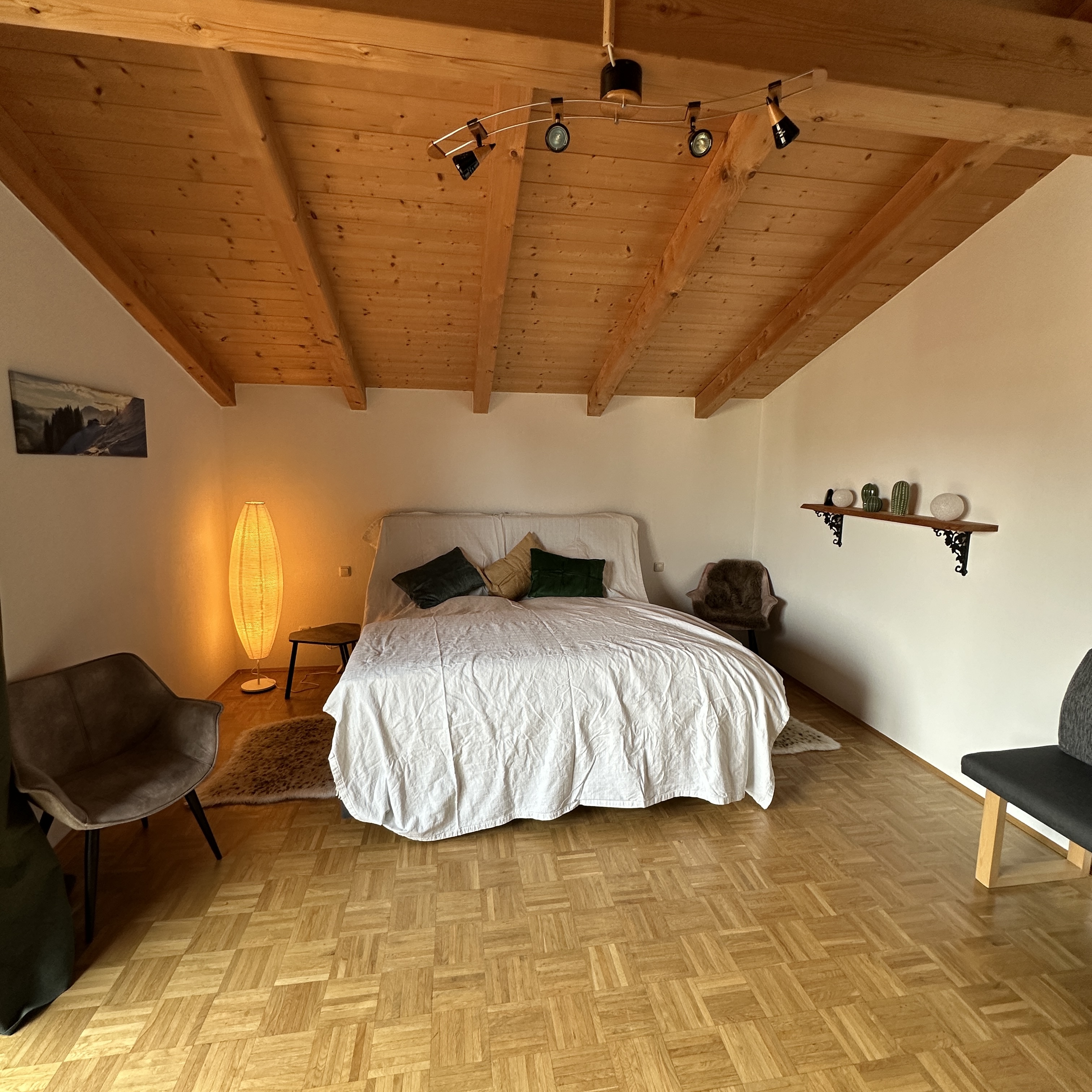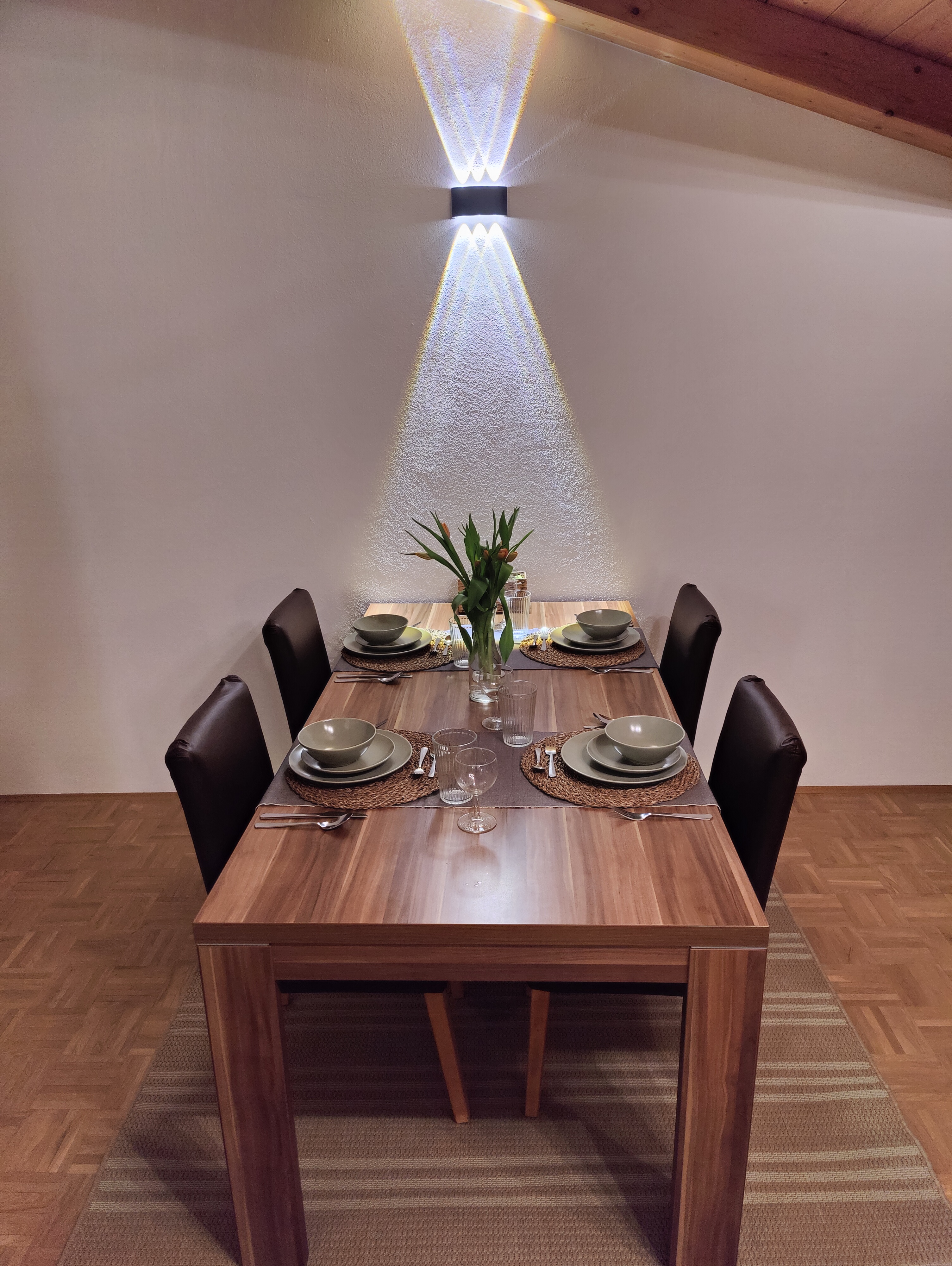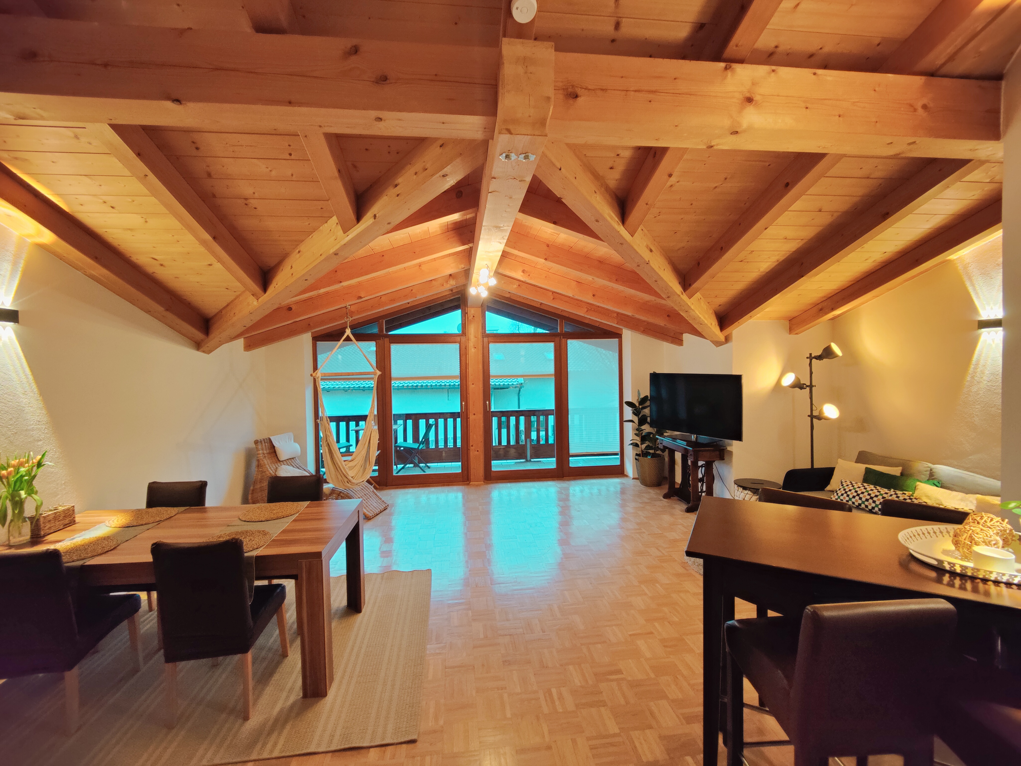 • Ein Wohnzimmer mit großen Fernseher, einer Ausziehcouch die Platz für 2 Personen bietet, einem großen Esstisch, einem Hochtisch und einem einer Lese/Sonnenecke beim Balkon. Und natürlich der Balkon selber der Ihnen Aussicht auf die zwei Seiten des Voralpengebietes gibt. Auf diesem Balkon befindet sich auch ein Tisch mit 2 Stühlen und eine kleine Couchgarnitur.