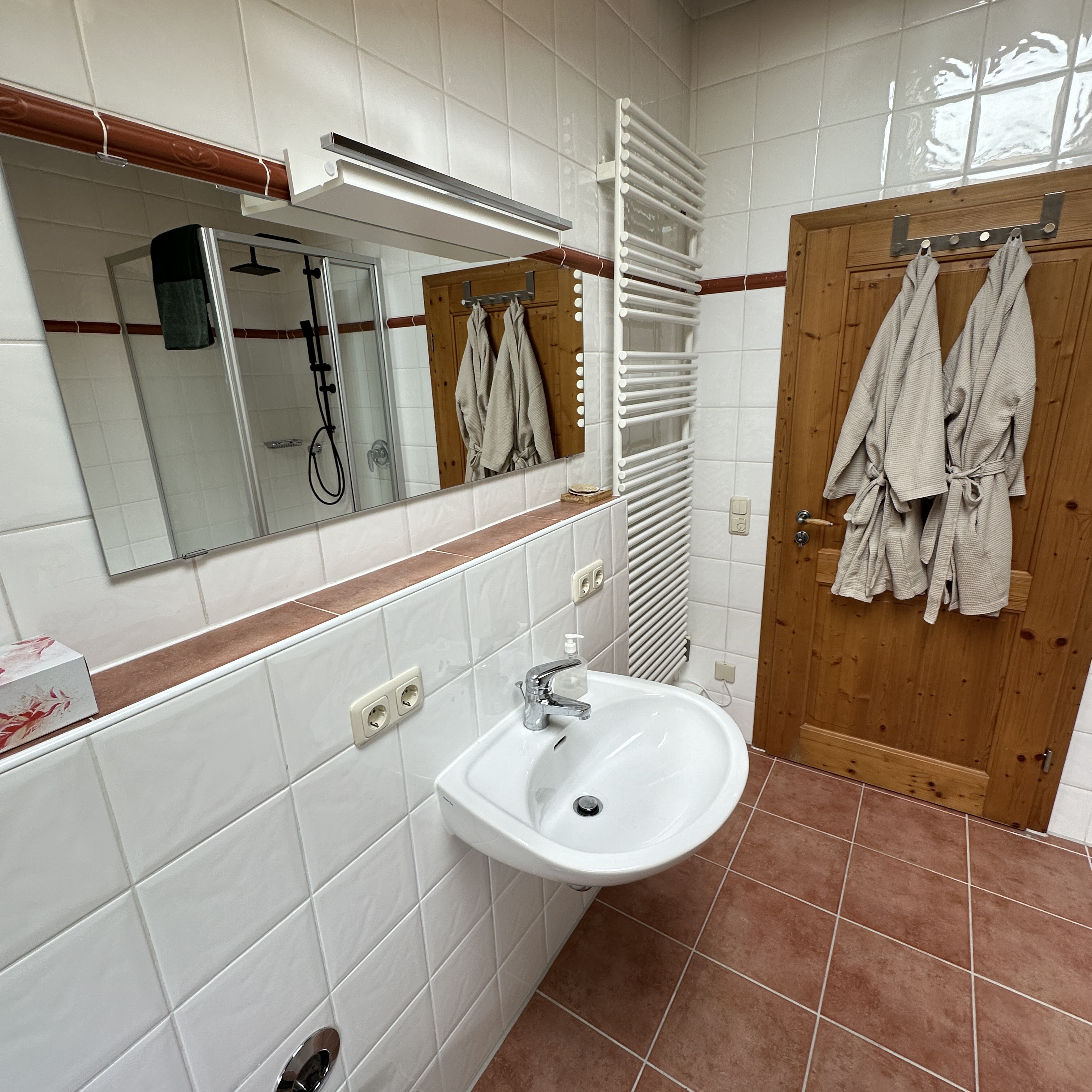 • Ein Badezimmer ist ausgestatte mit einer Waschmachine, einer Regenwald Dusche und einer Badewanne für Ihre Entspannung.
