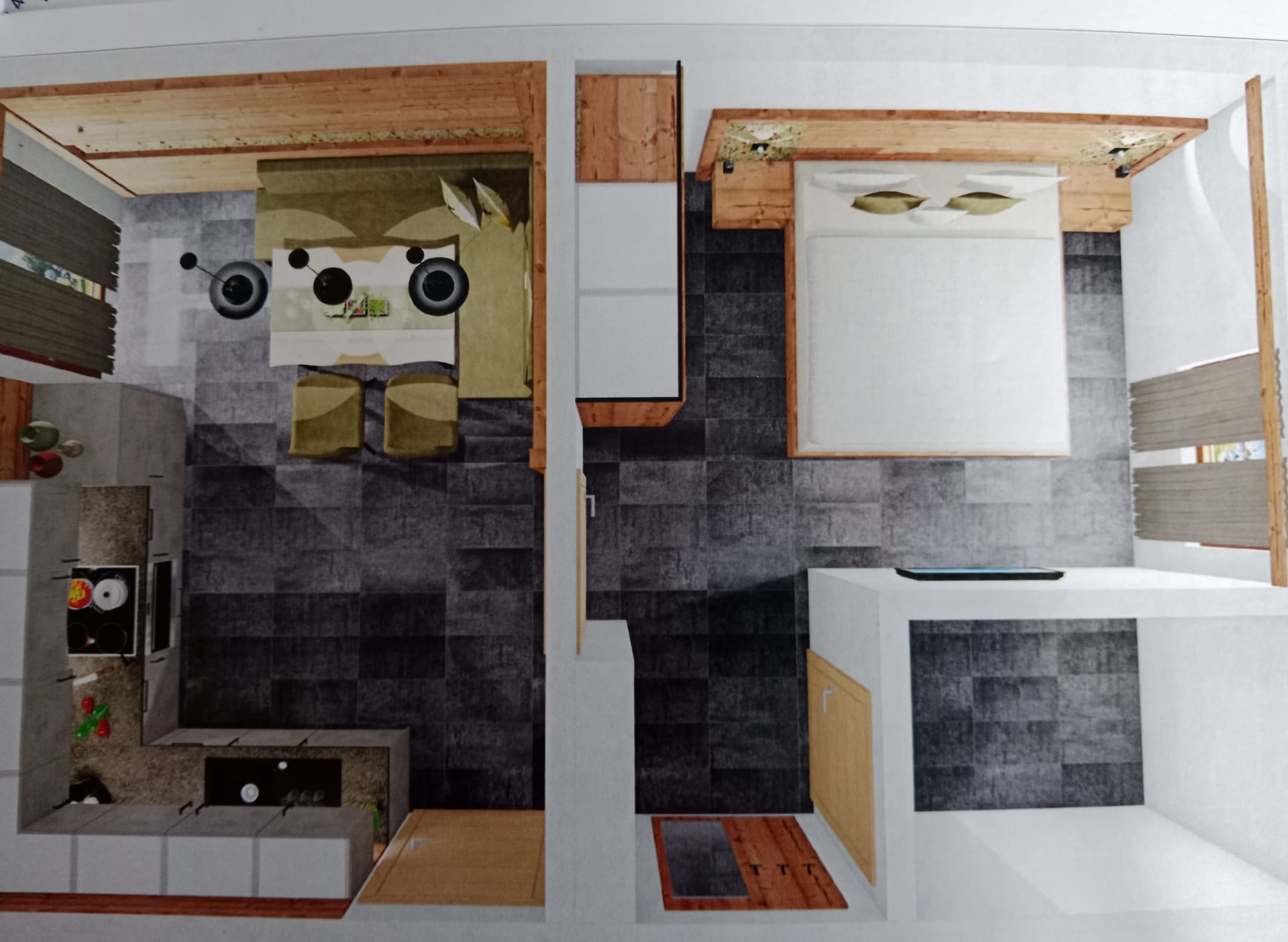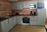 einer komplett eingerichteten Küche und einer Essecke, Das Doppelbett sorgt für einen guten Schlaf,