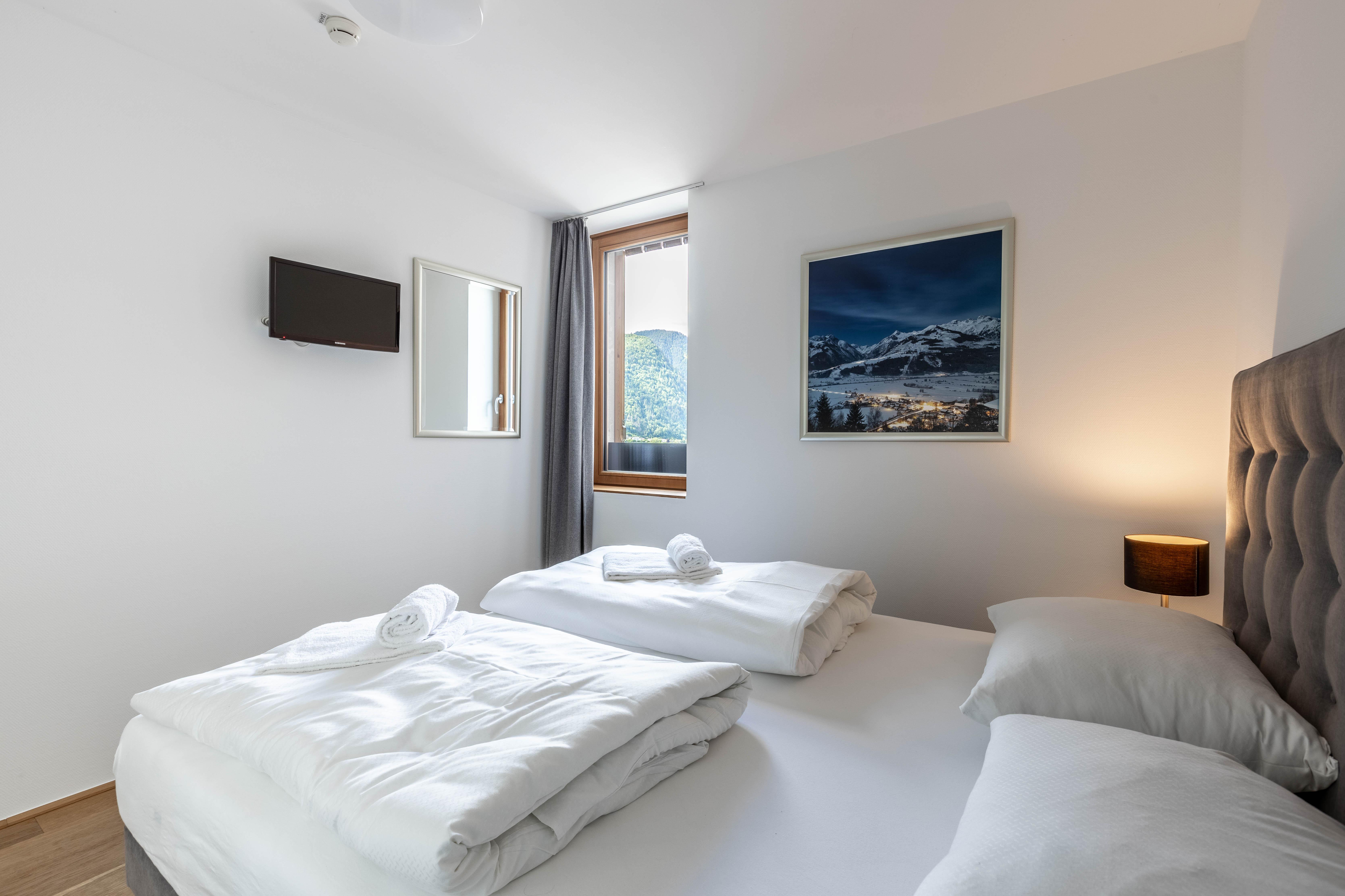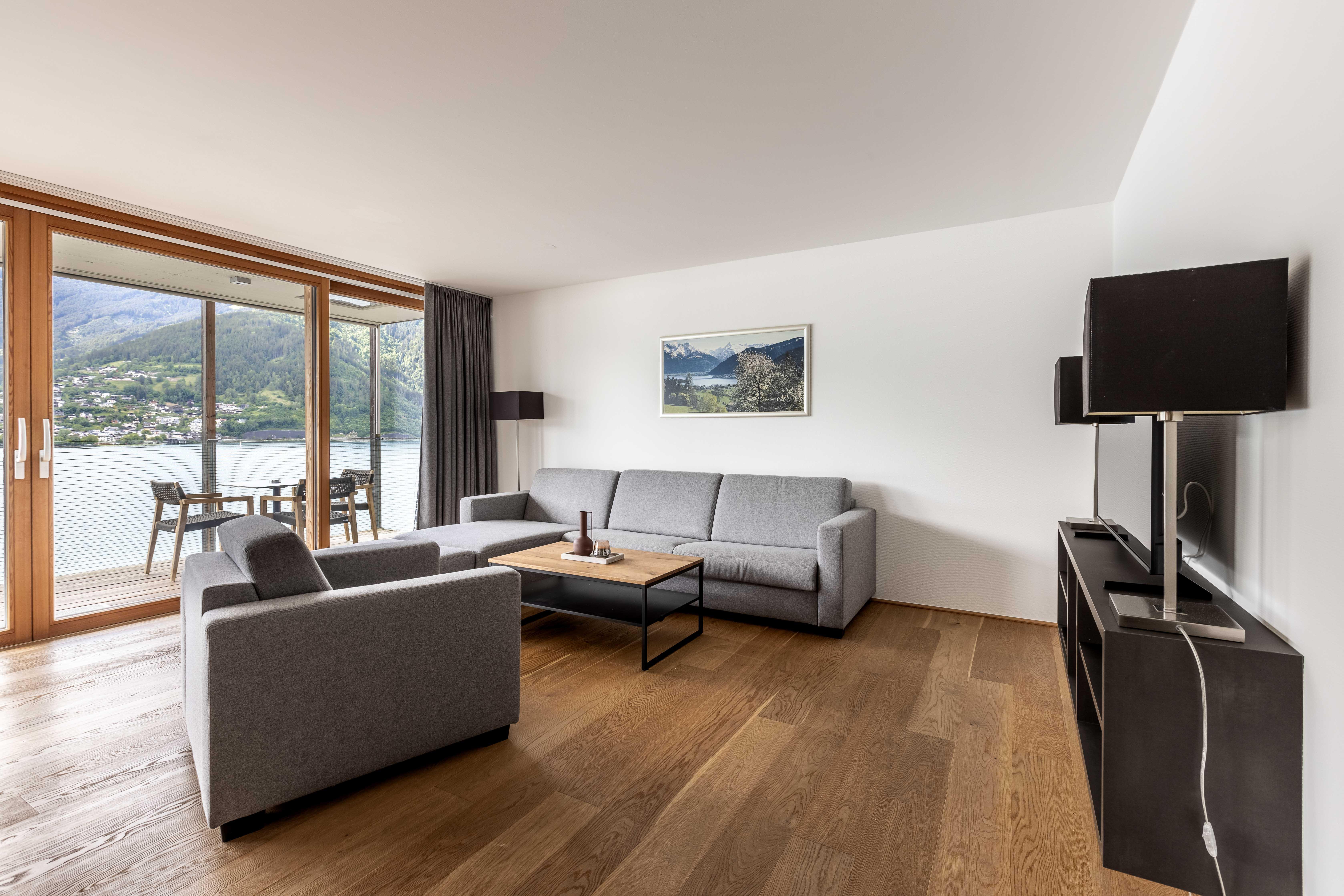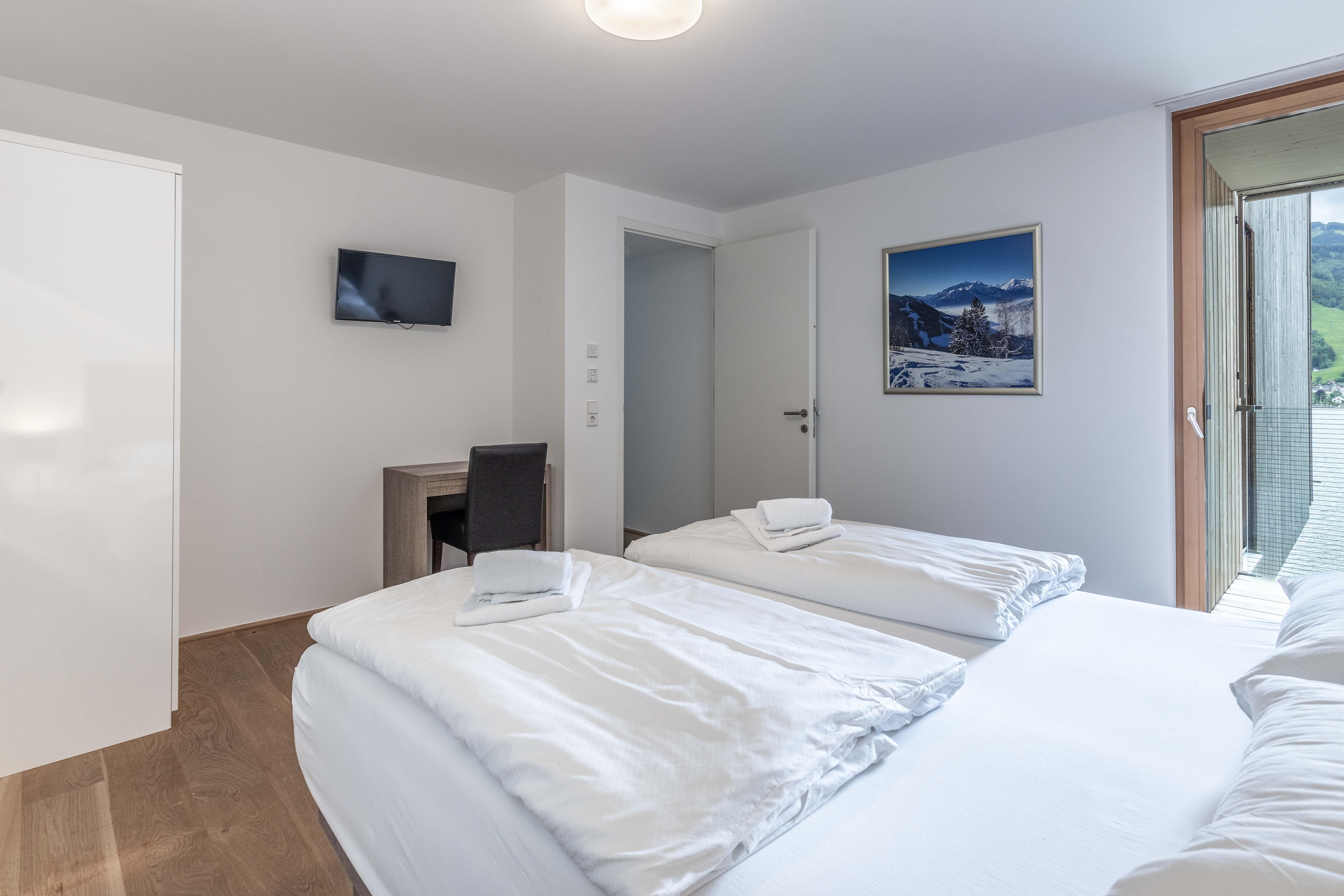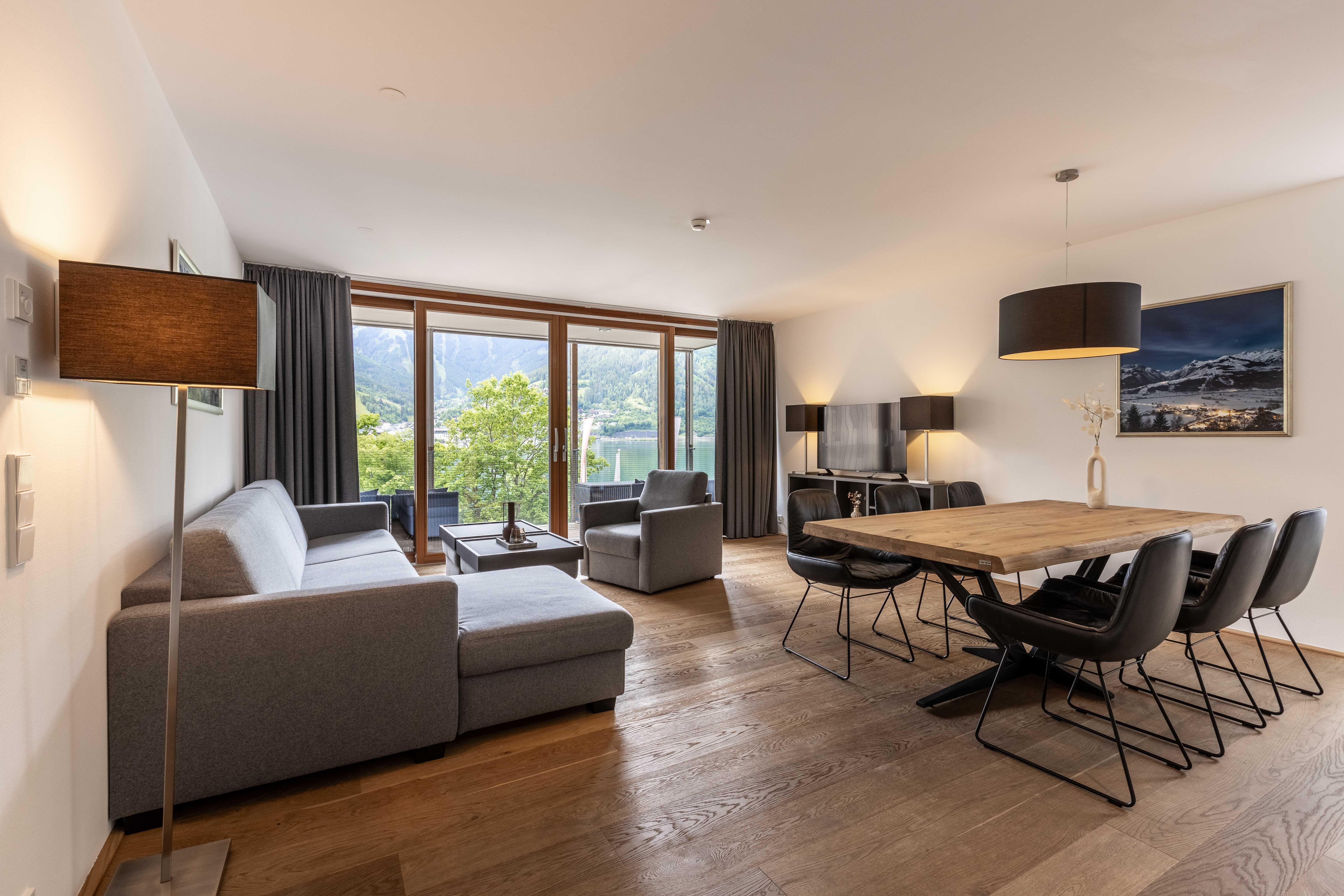 Willkommen im Bellevue Residences Top 5.2 Appartement mit herrlichem Seeblick! Auf 85m² bietet es Platz für bis zu 6 Personen. Es erwarten dich zwei Schlafzimmer mit Doppelbett, ein Wohnzimmer mit Doppelschlafcouch und offener Designerküche, sowie ein Badezimmer mit Badewanne/Dusche und WC. Zusätzlich gibt es ein weiteres separates WC. Vom Wohnzimmer aus gelangst du auf den Balkon, von dem aus du einen atemberaubenden Blick auf den Zeller See genießen kannst.