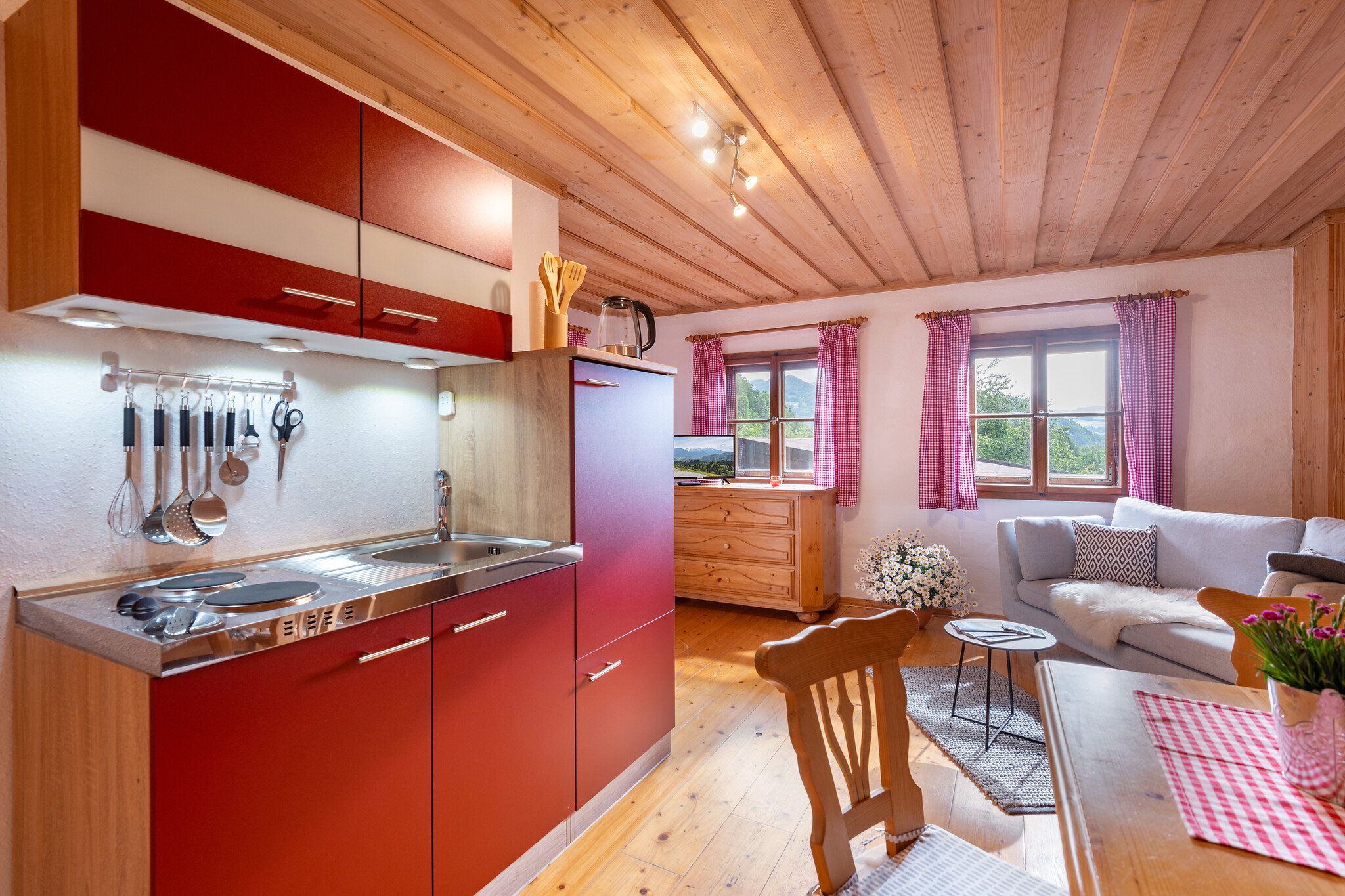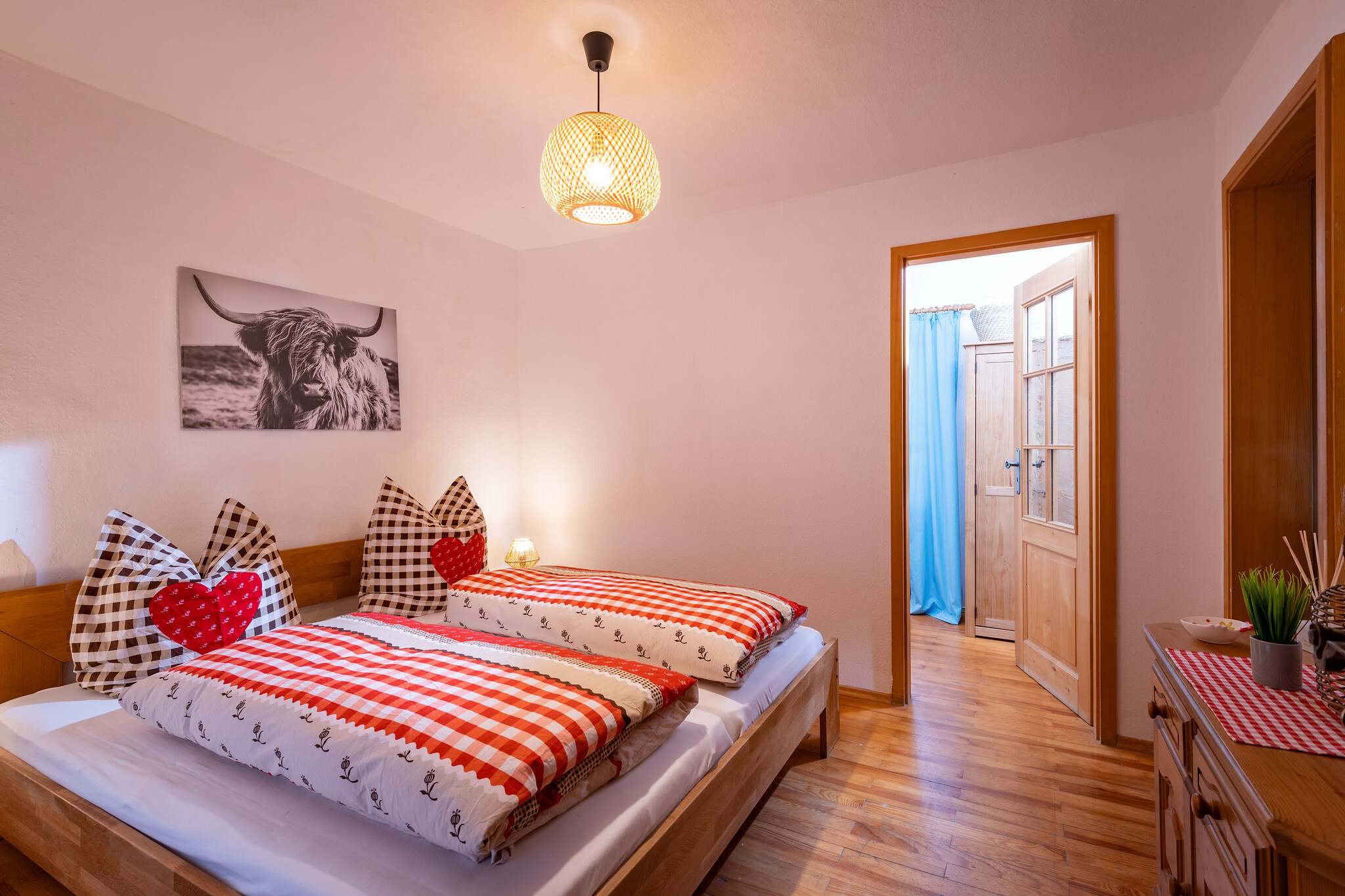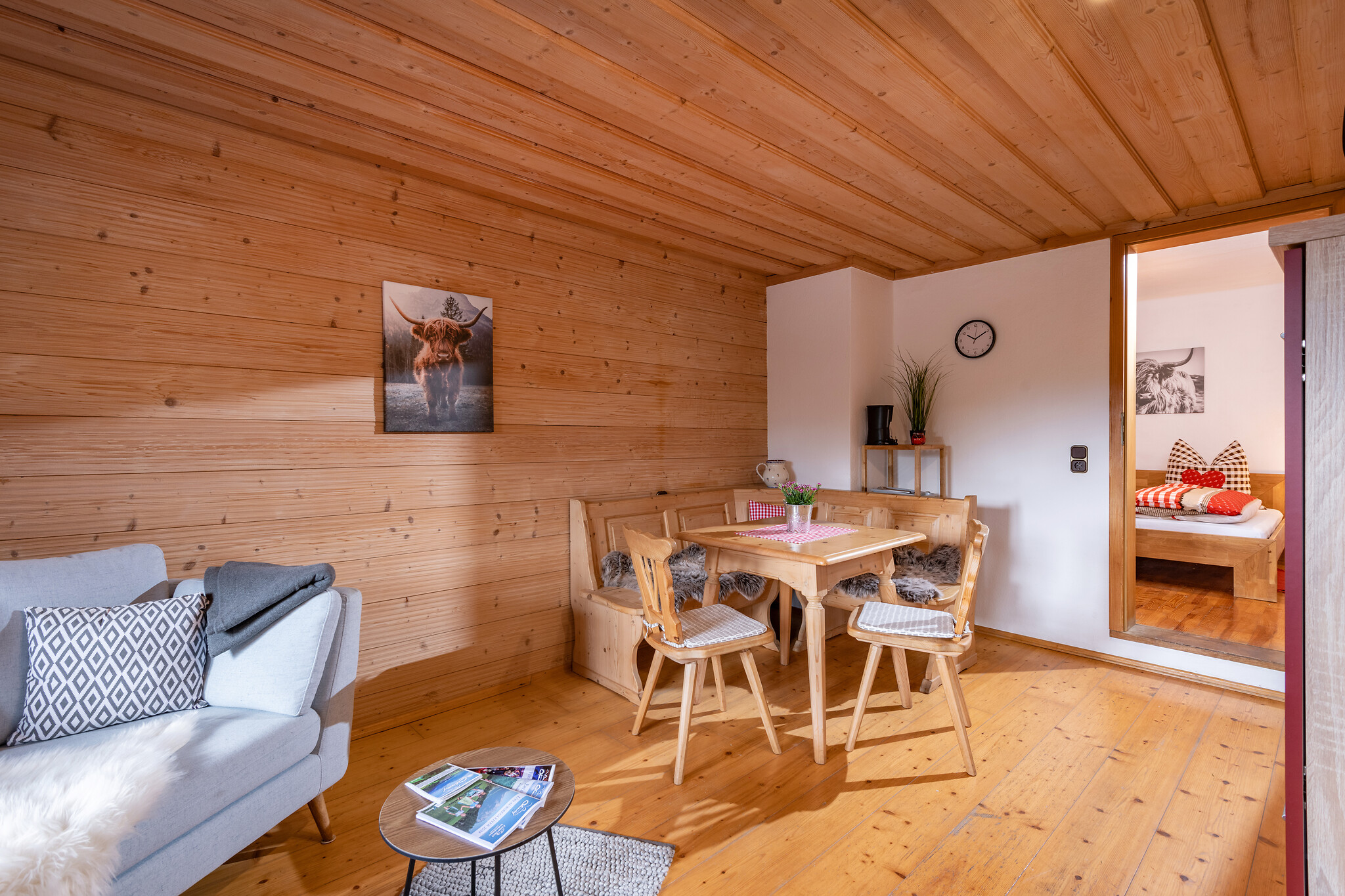 Unsere Ferienwohnung Hochland ist 50 qm groß und befindet sich im 1. Stock im Haupthaus. Die Wohnung ist mit viel Holz im gemütlichen Landhausstil eingerichtet. Es ist eine abgeschlossene Wohnung mit einem Schlafraum (1Doppelbett), Wohn-Essbereich, Bad (ebenerdige Dusche & Waschbecken) und separaten WC mit Waschbecken.