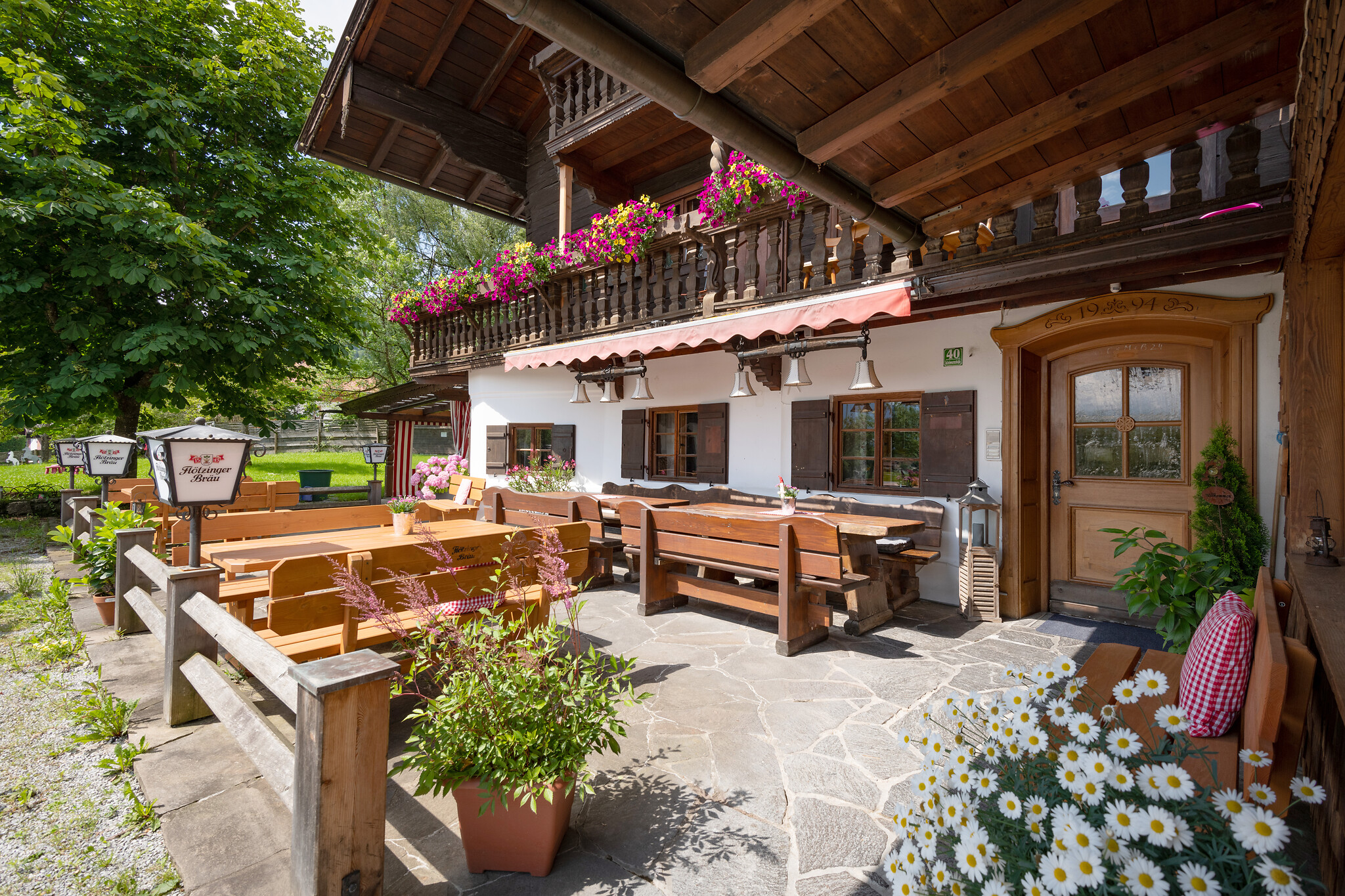 Die Terrasse vor dem Haupthaus darf gerne mitgenutzt werden. Ausgestattet mit Holzsitzgarnituren.