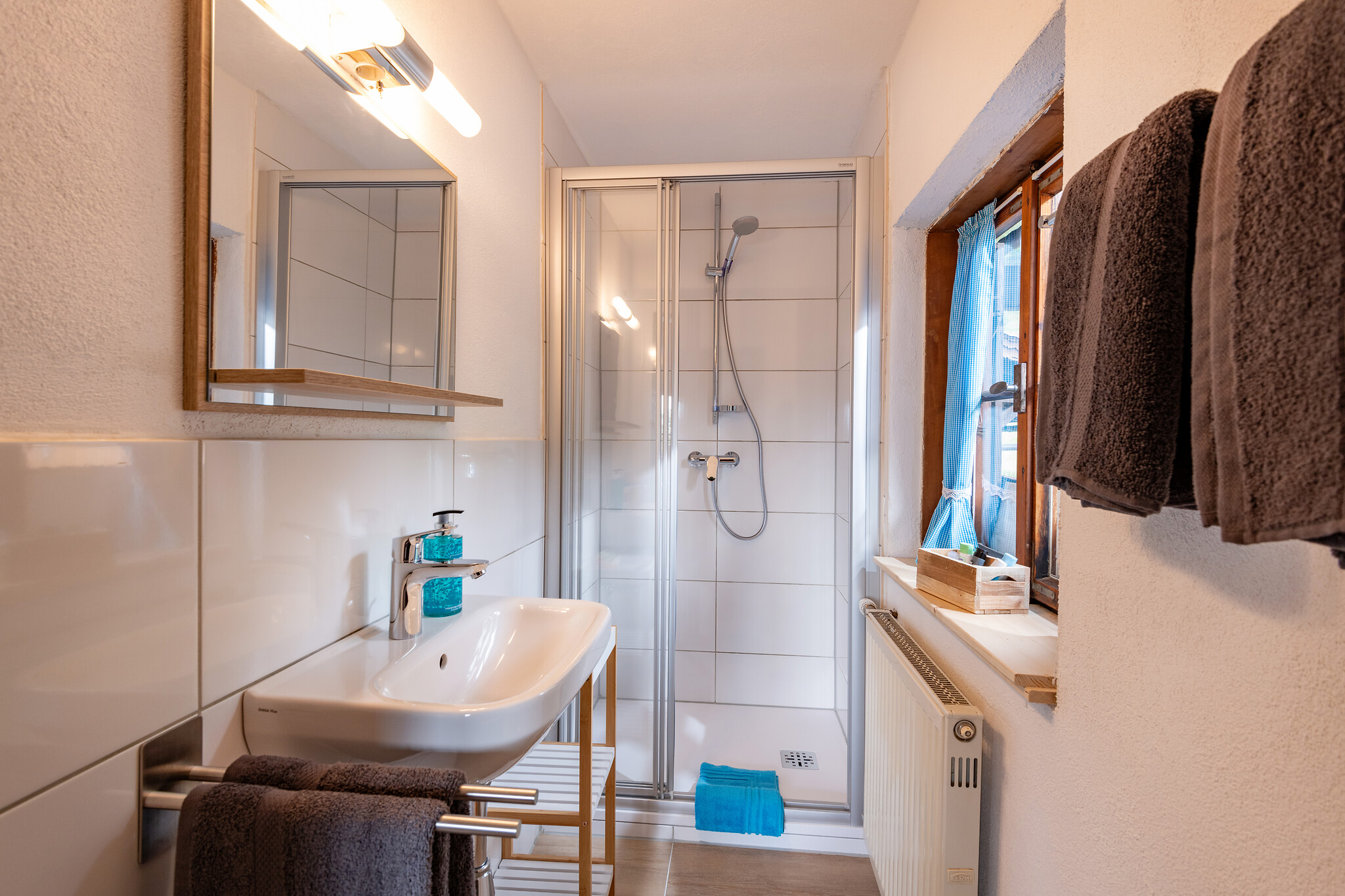 Im Badezimmer finden Sie Handtücher, Badvorleger, Fön, Flüssigseife, Toilettenpapier und Kosmetiktücher.