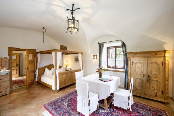 Schlossromantik pur in den ruhigen, kuscheligen, wohlig warmen, zirbenholzduftenden Gemächern, auf der Sonnenterrasse am Schloss-Teich oder im historischen Gewölbe von anno 1150.