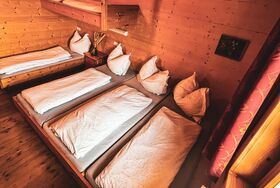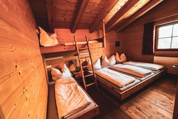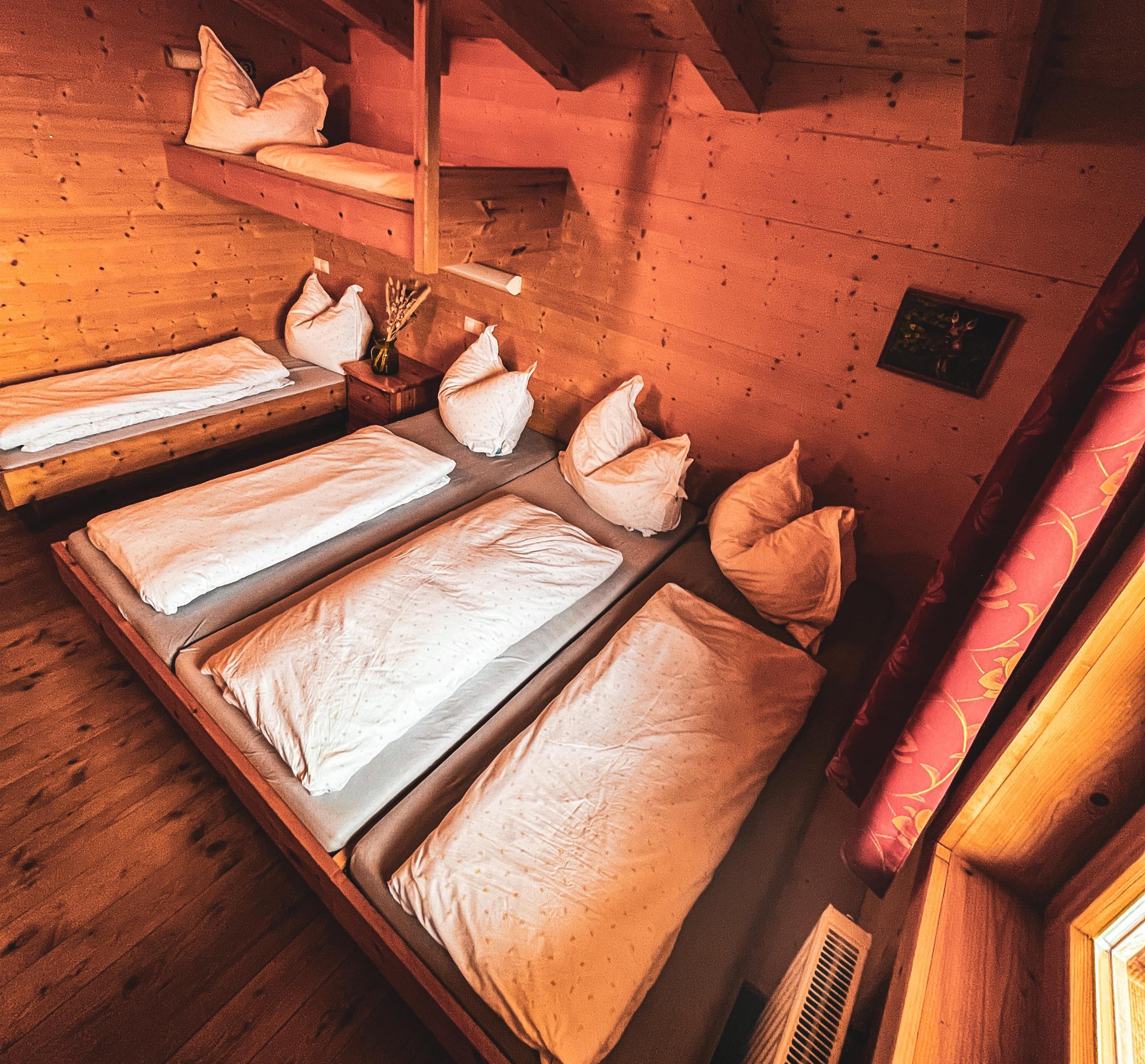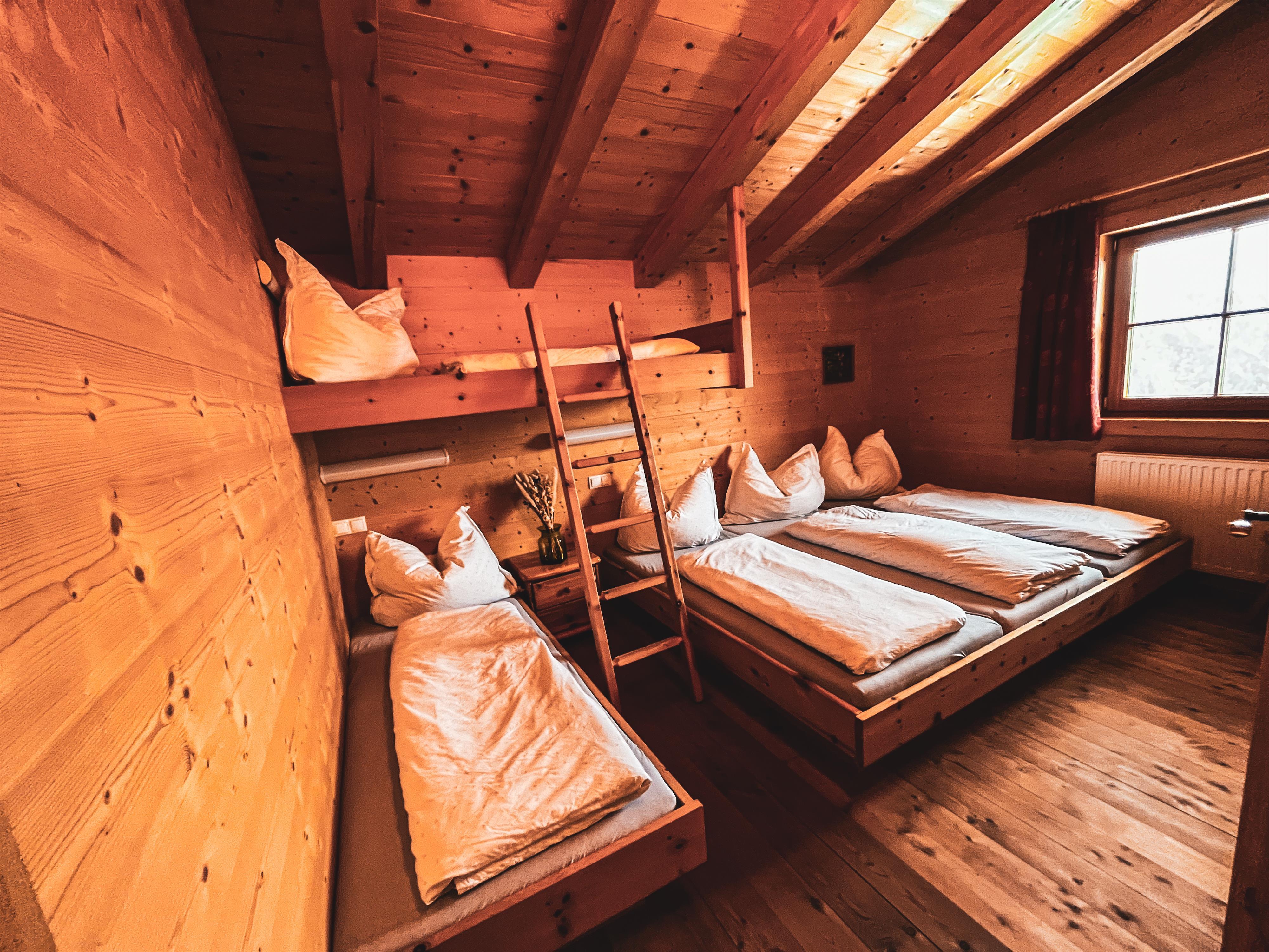 Uriges Fünfbettzimmer mit Doppelbetten für 3 Personen, 1 Einzelbett und 1 Stockbett und mit wunderschönen Bergblick. 2 Etagenbadezimmer mit Dusche und Waschbecken. Separates WC. Ca. 10 m²