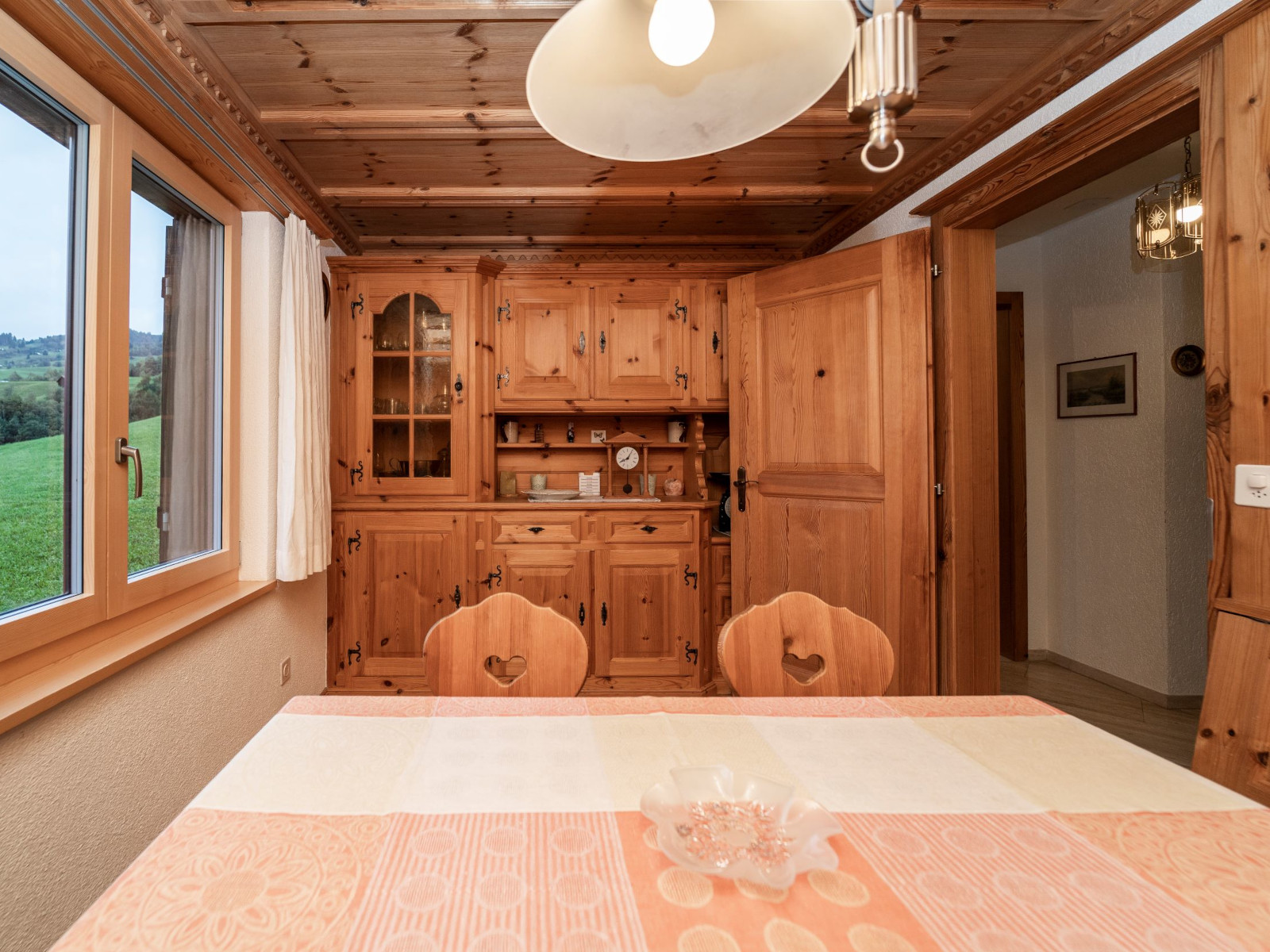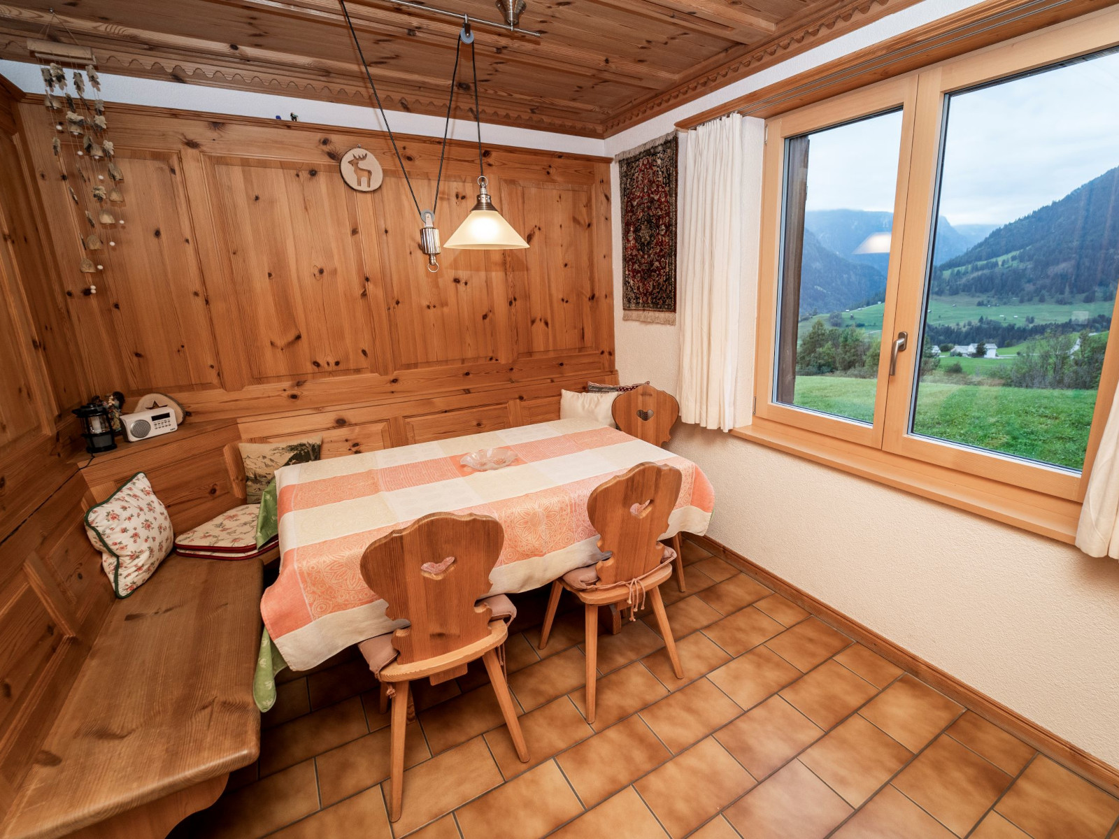 Gemütliche, holzvertäfelte Stube mit Esstisch, Eckbank, Stühlen und grossem Geschirrschrank. Mit grandiosem Ausblick auf das süd-westliche Bergpanorama. Kinderhochstuhl mit Babybügel vorhanden. Badezimmer:
