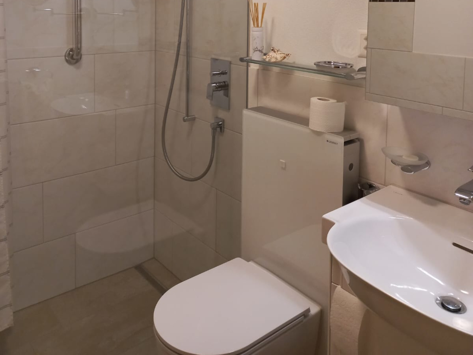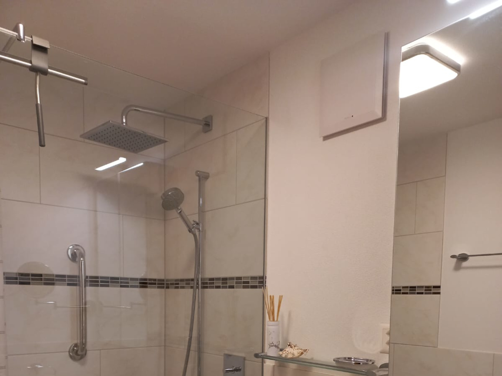 Modernes Badezimmer mit grosser Dusche, Waschbecken, WC sowie separates Gäste-WC. Ggf. eigene Frotteewäsche selbst mitbringen. Sonstiges: