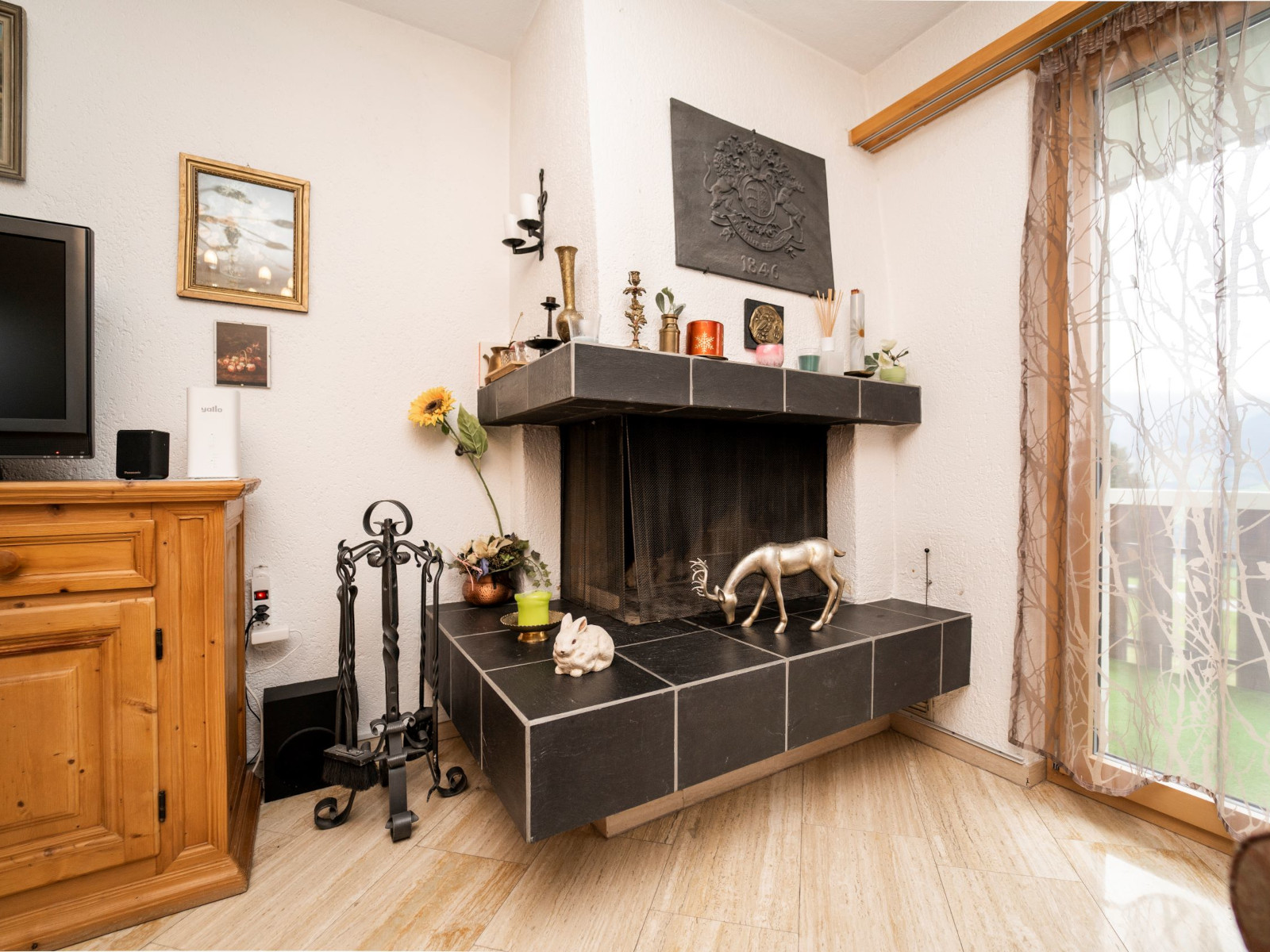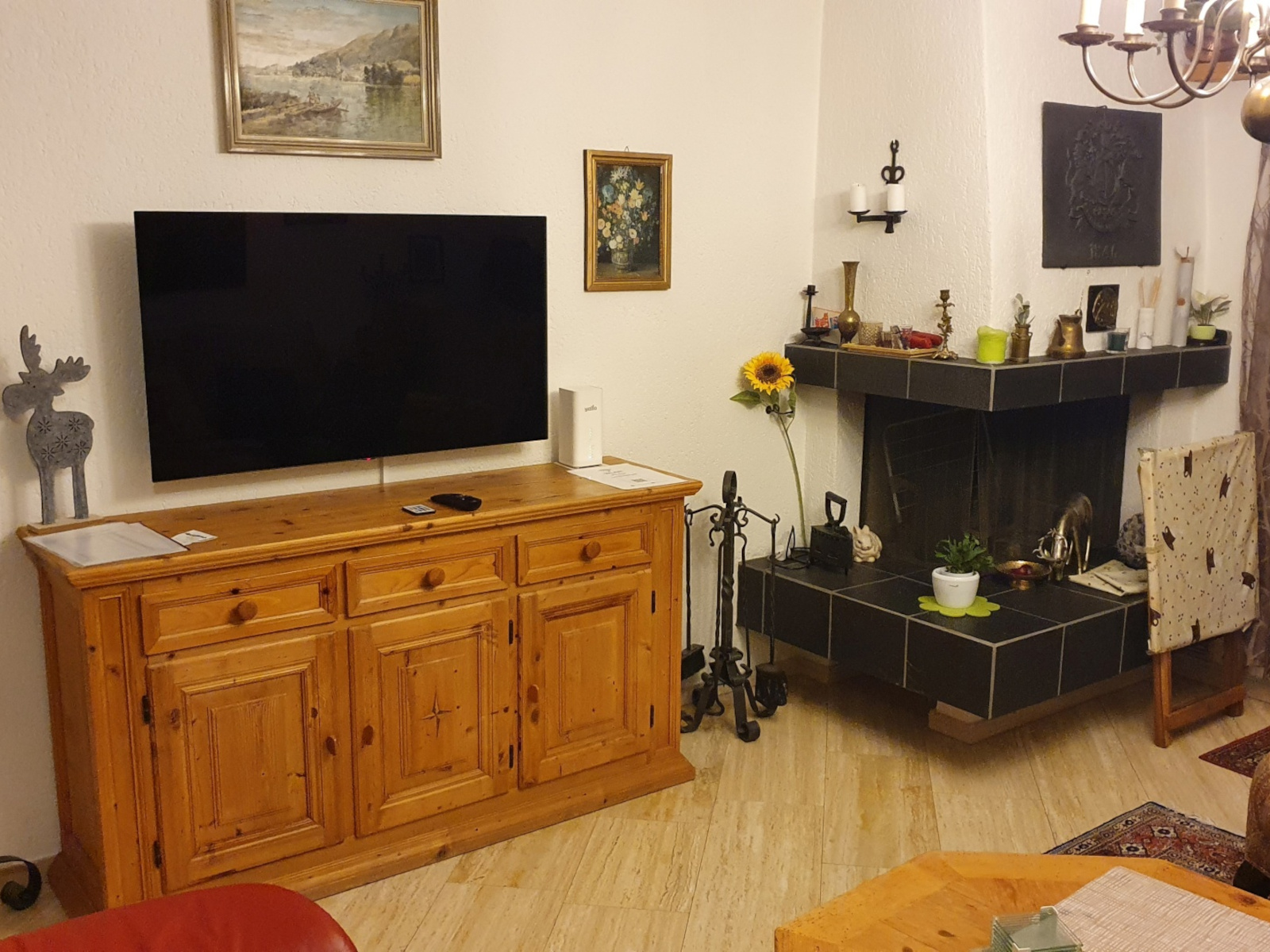 Gemütliches Wohnzimmer mit einem Kamin und einem Schlafsofa für 2 Personen. Grosser 48’’ OLED Smart-TV, Internetverbindung via WLAN-Router. Küche: