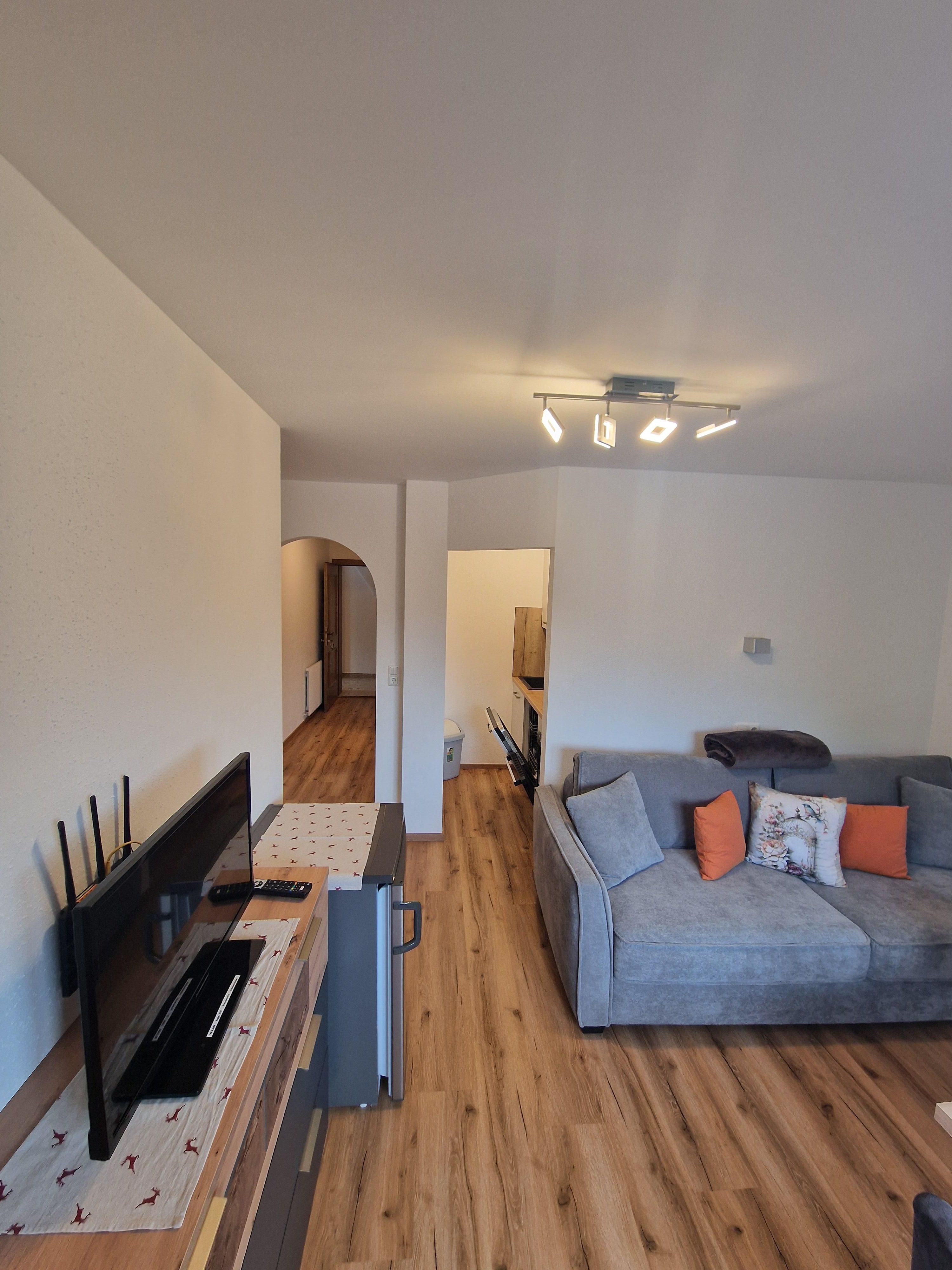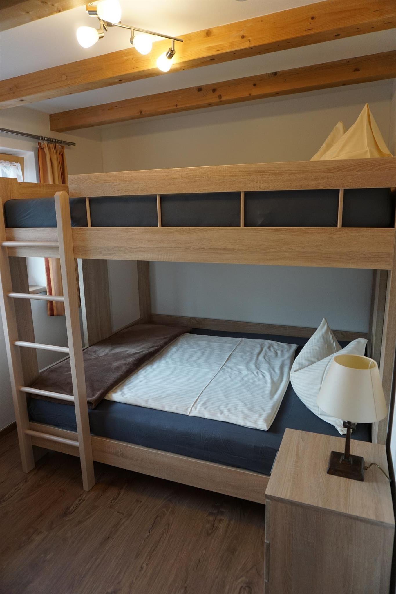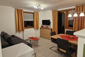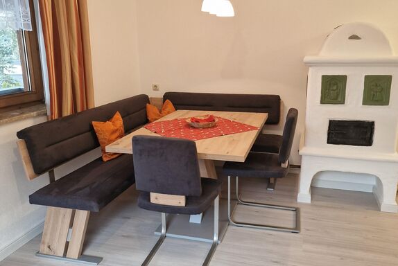 Die Ferienwohnung ((ca. 70 m2) mit zwei Schlafzimmern, einem Wohnschlafraum mit Kachelofen und ausziehbarer Couch, Sitzecke, Kochnische, getrenntes Bad/WC, Balkon oder Terrasse, Kabel-TV, Radio, gebührenfreier Internetanschluss.
