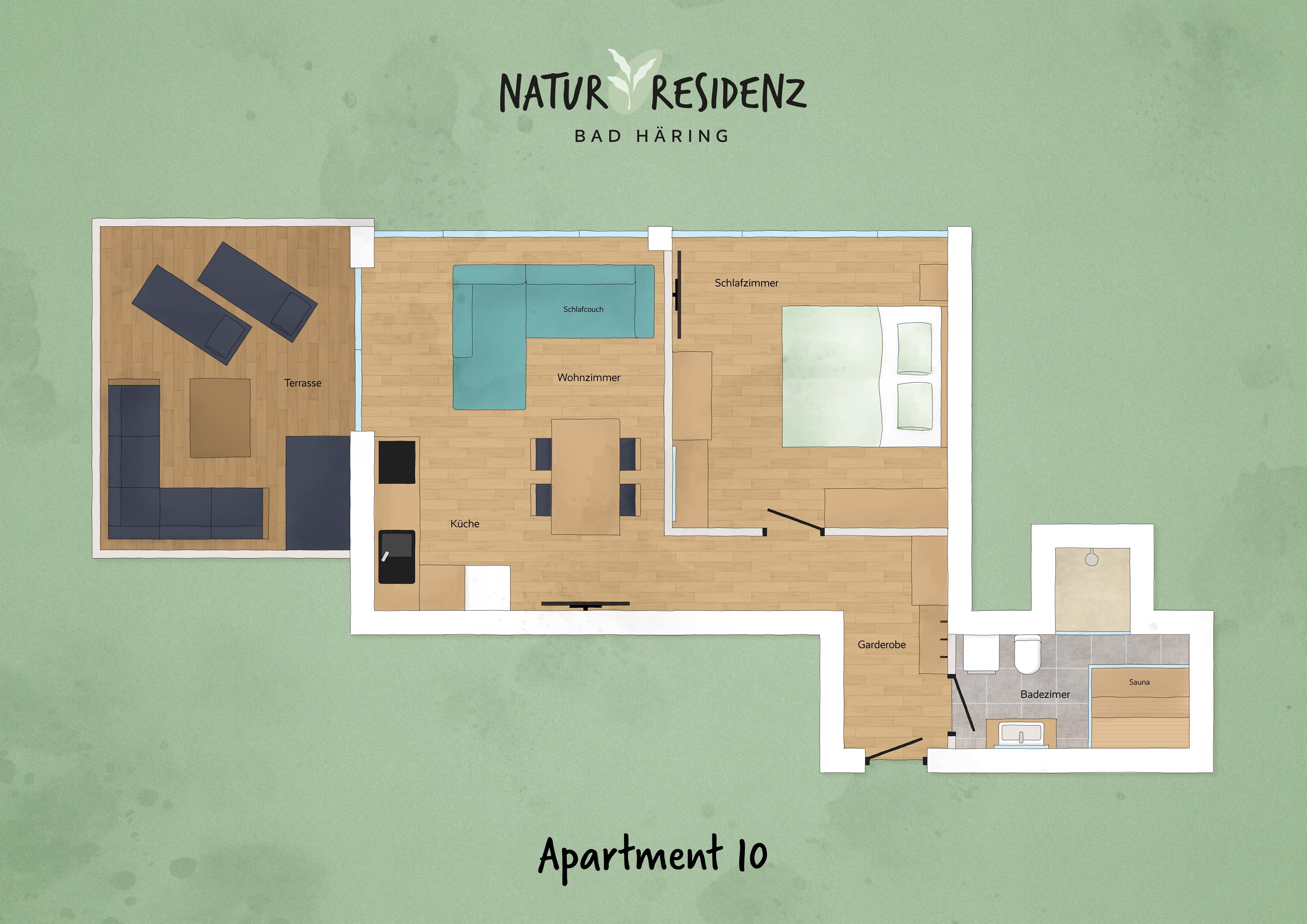 Herzlich willkommen in den gemütlichen und stilvoll eingerichteten Apartments von der Natur Residenz Bad Häring. Das Apartment 10 ist Dein zu Hause auf Zeit im malerischen Bad Häring. Großzügige 51m² warten darauf von dir bewohnt zu werden. Es gibt einen geräumigen Wohn- und Schlafbereich mit Doppelbett und Schlafcouch, sodass bis zu 4 Personen im Apartment 10 wohnen können. Die Küchenzeile lädt zu gemütlichen Kochabenden aller Art ein. Weiters verfügt der Wohnraum über eine komfortable Couch auf welcher man entspannen und auf dem großen Smart-TV fernsehen kann. Einfach zurücklehnen und das herrliche Ambiente genießen, eine warme Dusche im angrenzenden Badezimmer nehmen oder auf dem ebenfalls angrenzenden Terasse die letzten Sonnenstrahlen des Tages einfangen. Das alles ist möglich in Deiner Natur Residenz Bad Häring. Das - und noch vieles mehr - also nichts wie los und ab in die Berge Tirols!