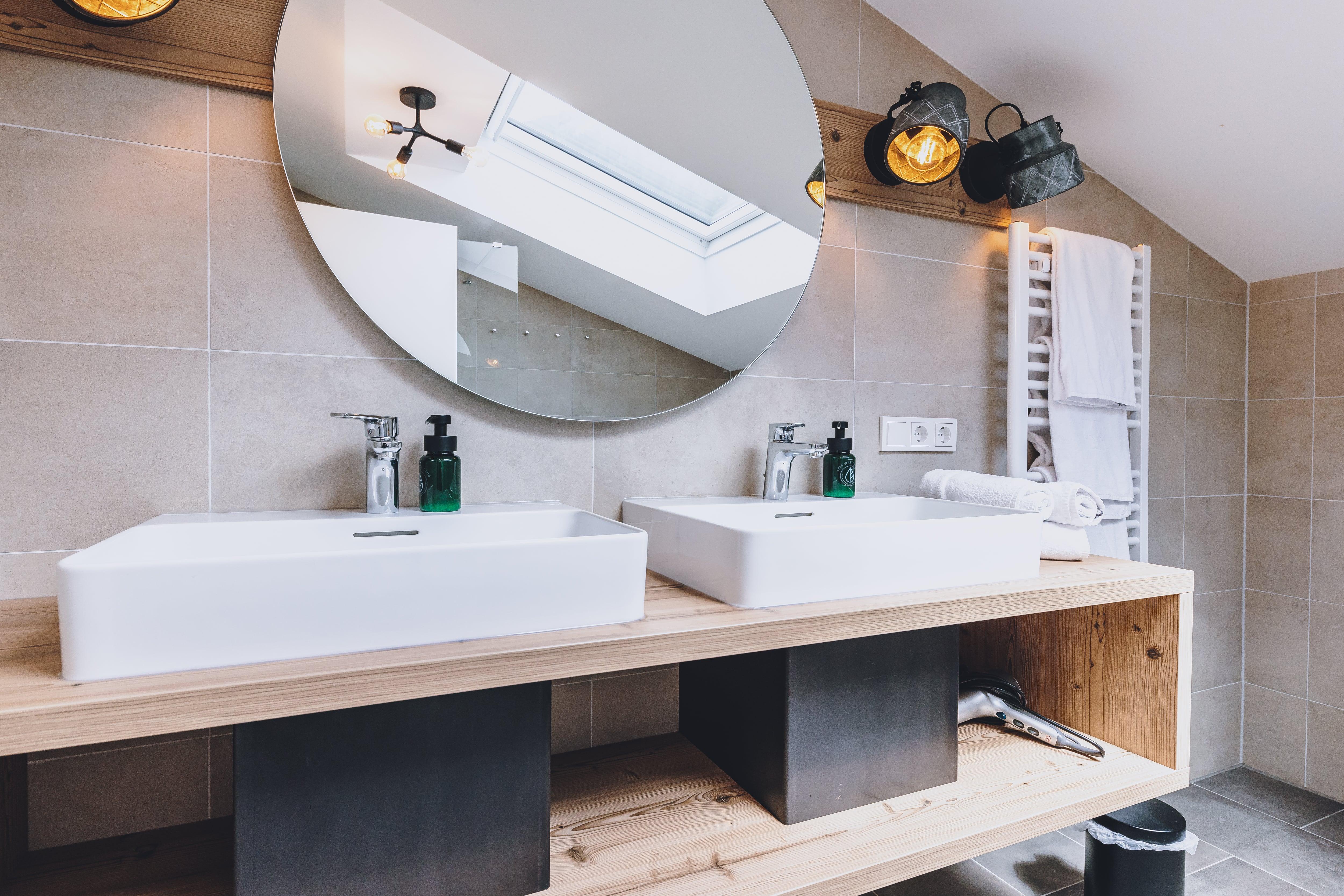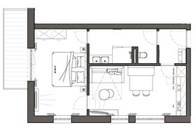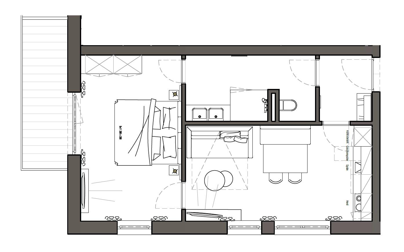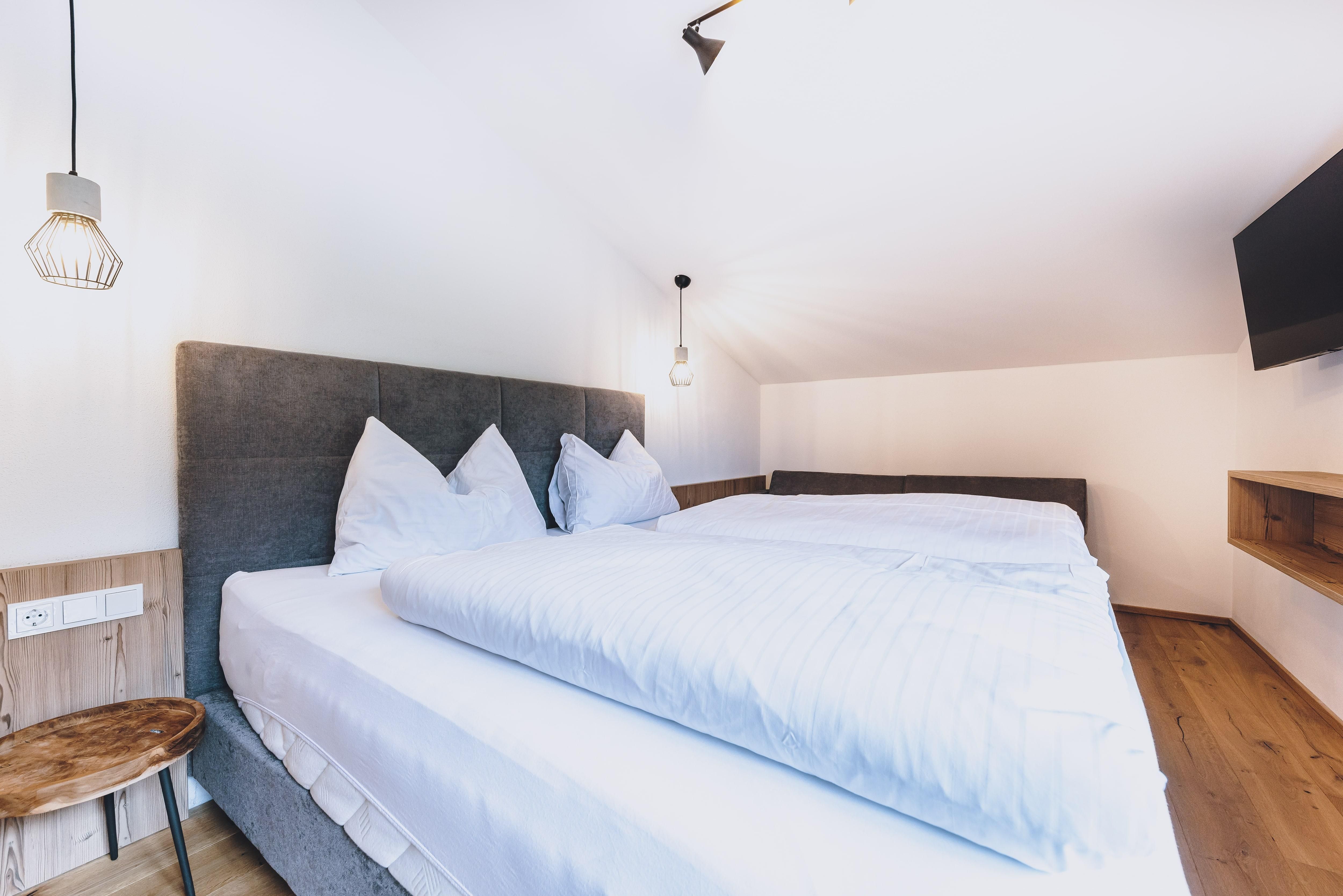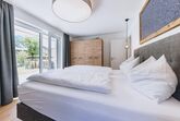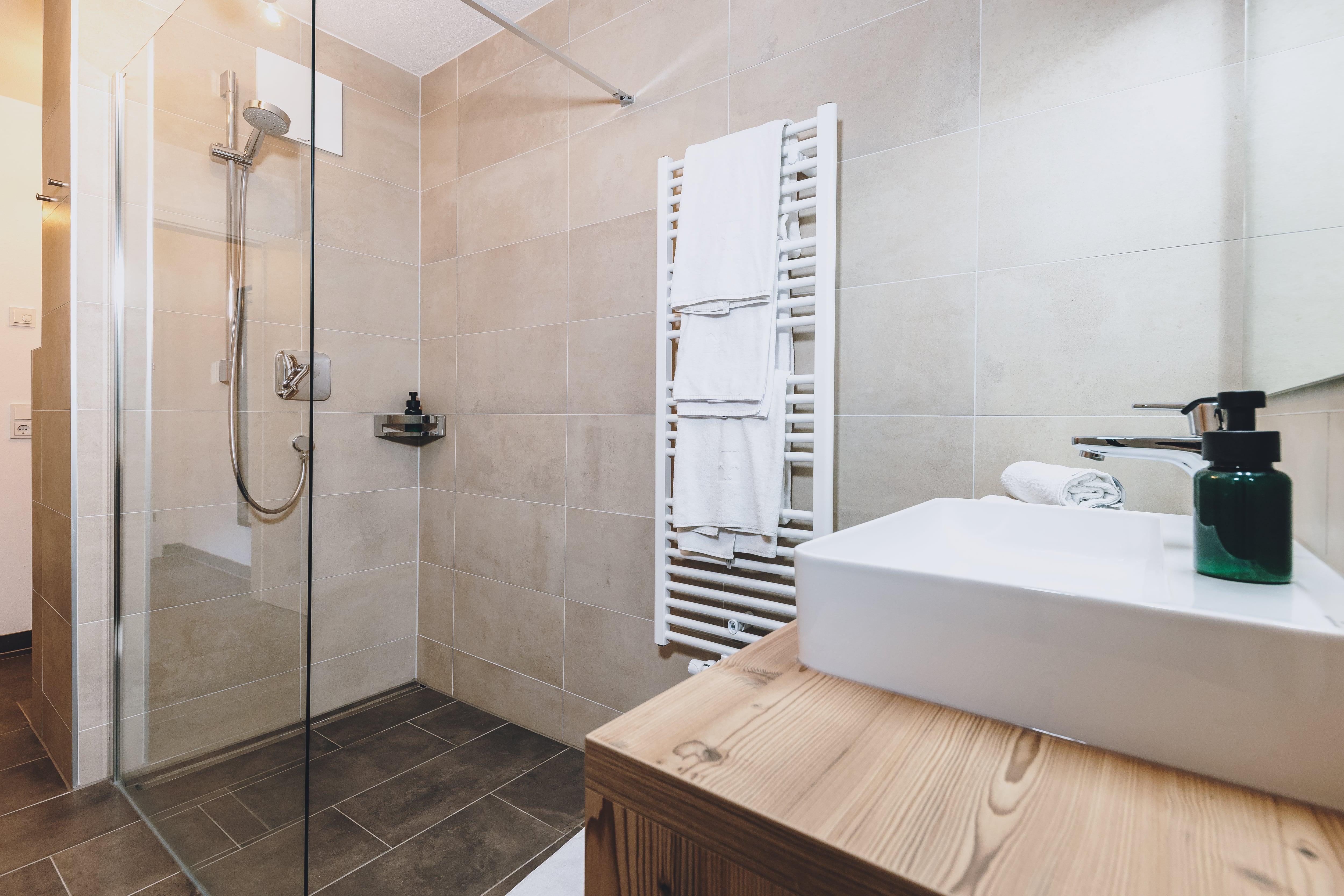 Die Apartments im 1. Obergeschoss verfügen über 50m² Wohnfläche (Wohnzimmer, separates Schlafzimmer, Badezimmer mit Dusche & WC und Balkon).