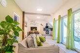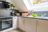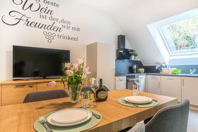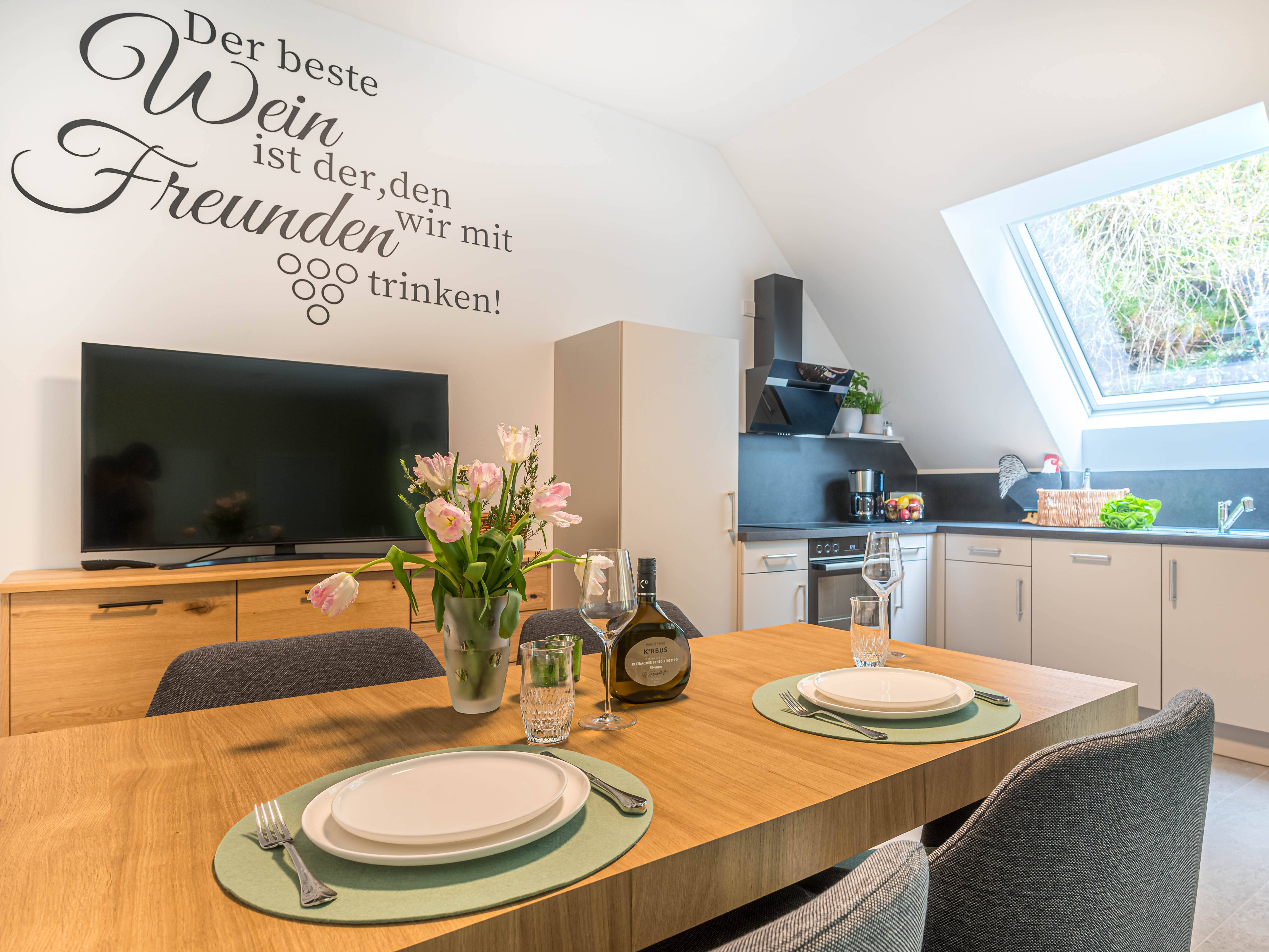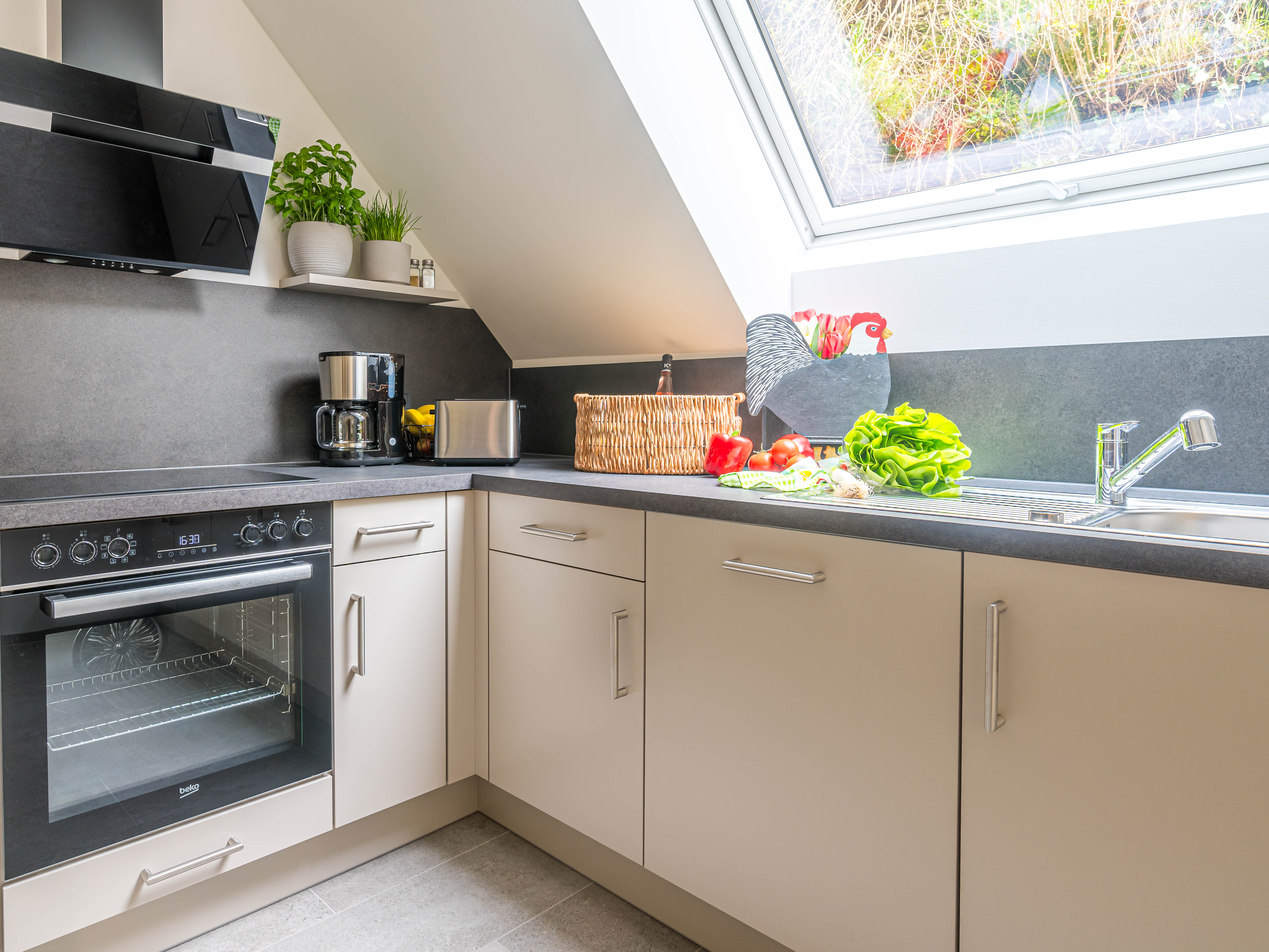Die offene, voll ausgestattete Küche mit Herd, Spülmaschine, Kühlschrank incl. Gefrierfach, Toaster, Kaffeemaschine, Wasserkocher ist hell und besticht durch sein großflächiges Dachflächenfenster.
