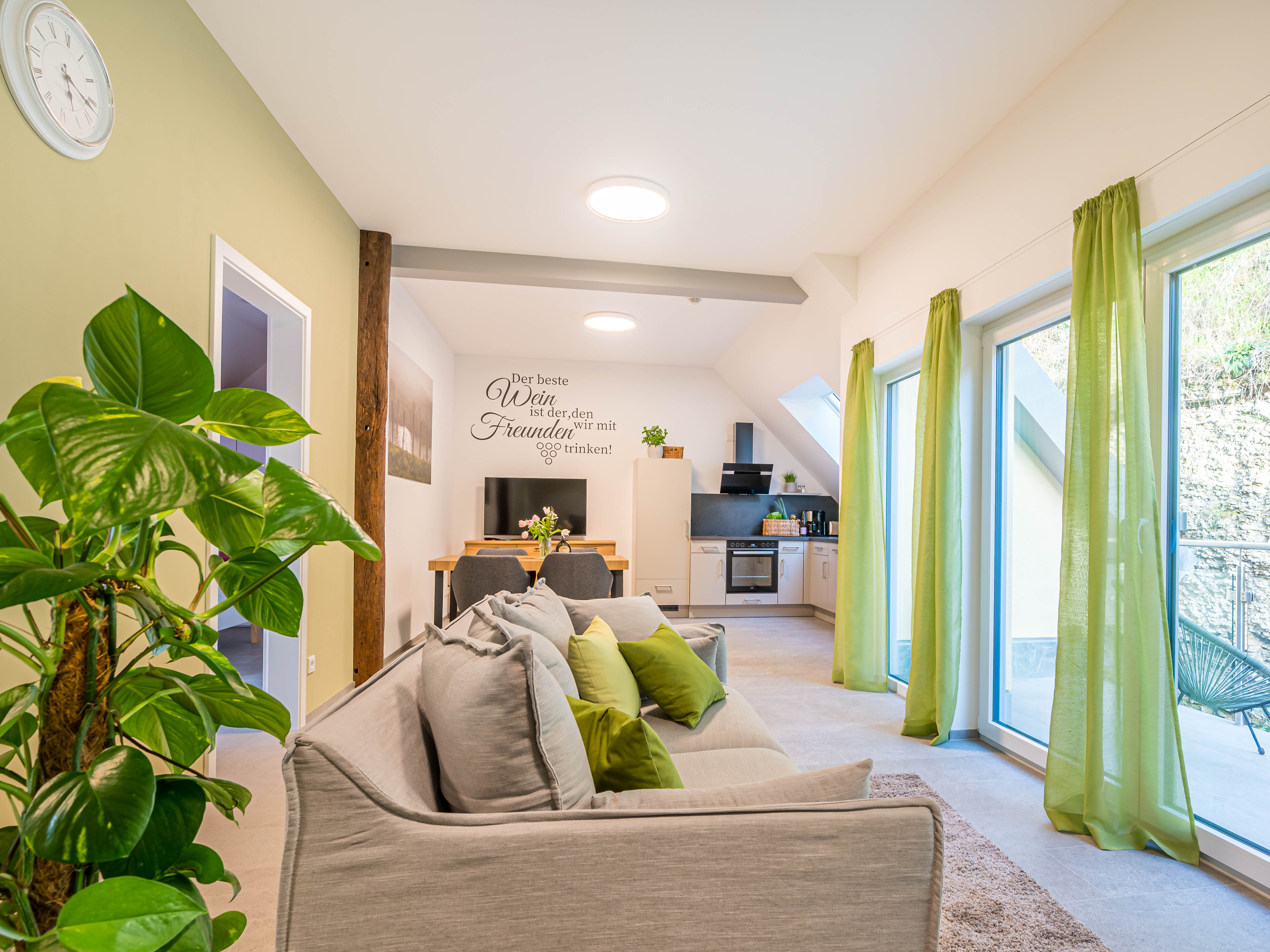 Ein Blick auf den Balkon ist dem gewährt, der auf der Couch etwas Ruhe sucht. Wobei der
