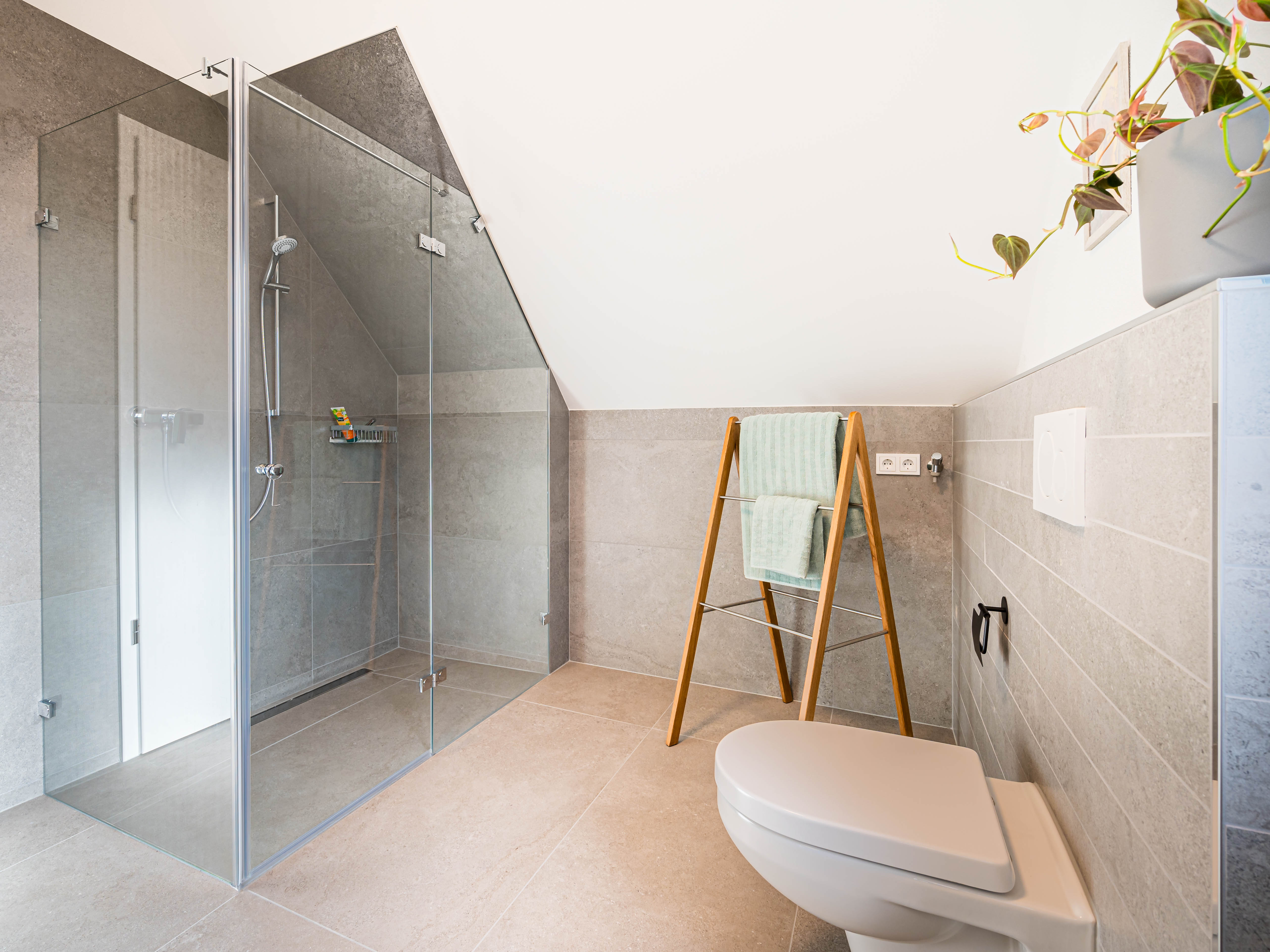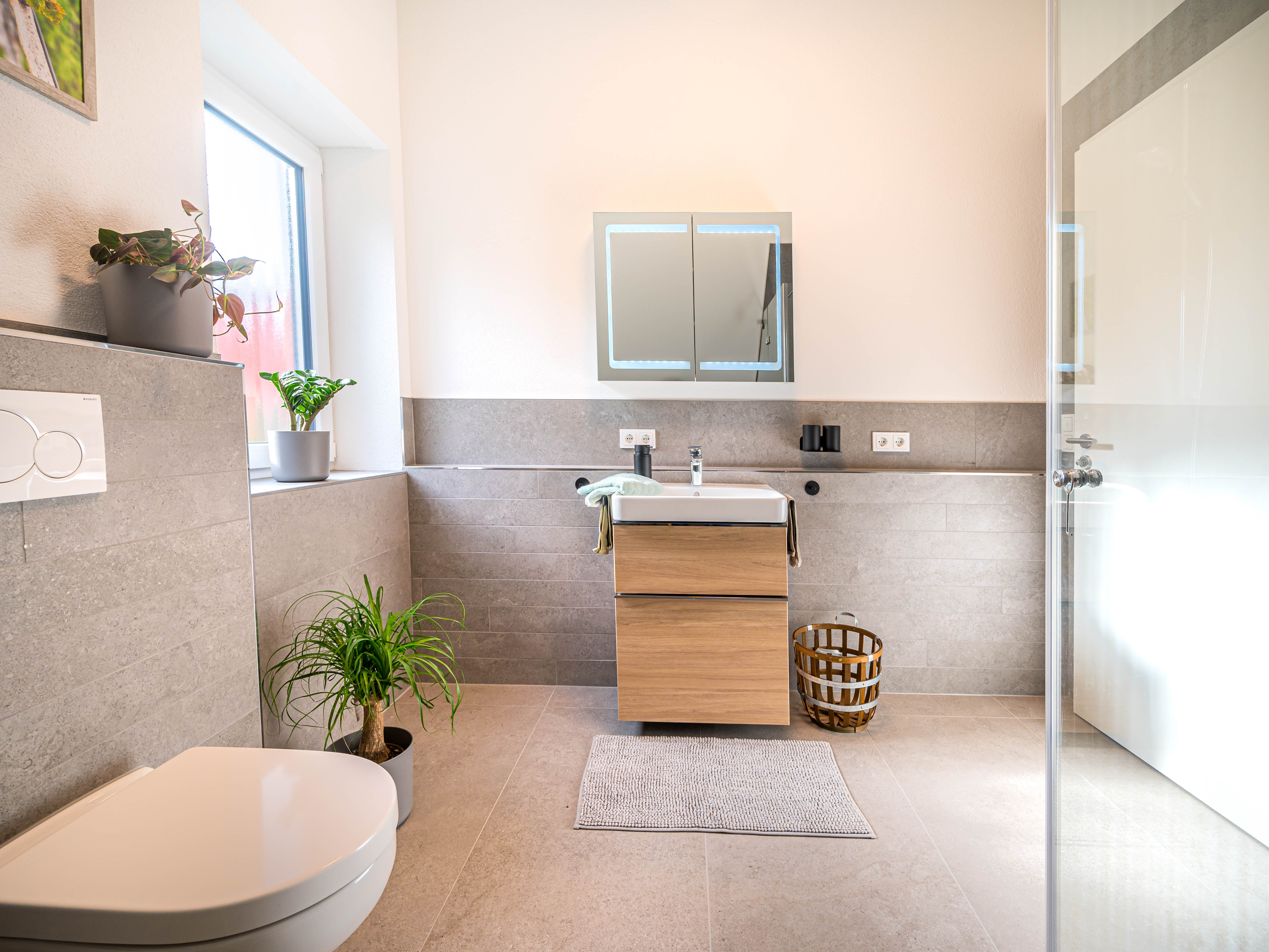 Das Tageslicht-Bad hat eine ebenerdige, geräumige Dusche, Waschbecken, WC und einen beleuchteten Spiegelschrank. Ebenso liegen Handtücher und Fön bereit.