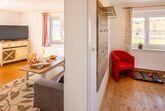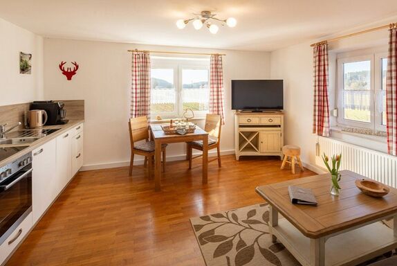 Der offene Wohn-/Essbereich verfügt über ein Sofa, TV, eine gut ausgestattete Küchenzeile und eine gemütliche Essgruppe.