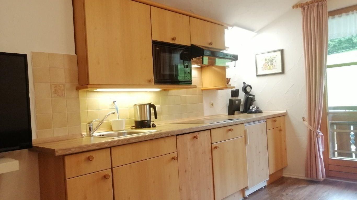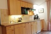 Die Küchenzeile ist ausgestattet mit einer Senseo Kaffeepadmaschine, Spülmaschine, einem 4-Platten-Cerankochfeld, Wasserkocher, Toaster, Mikrowelle sowie Ess- und Kochgeschirr.