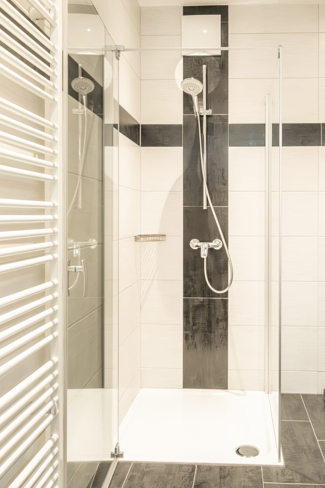 Ein großes Badezimmer mit Dusche und ein getrenntes WC gibt es ebenso, wie eine voll ausgestattete Küche mit Kaffeemaschine und großem Kühlschrank.