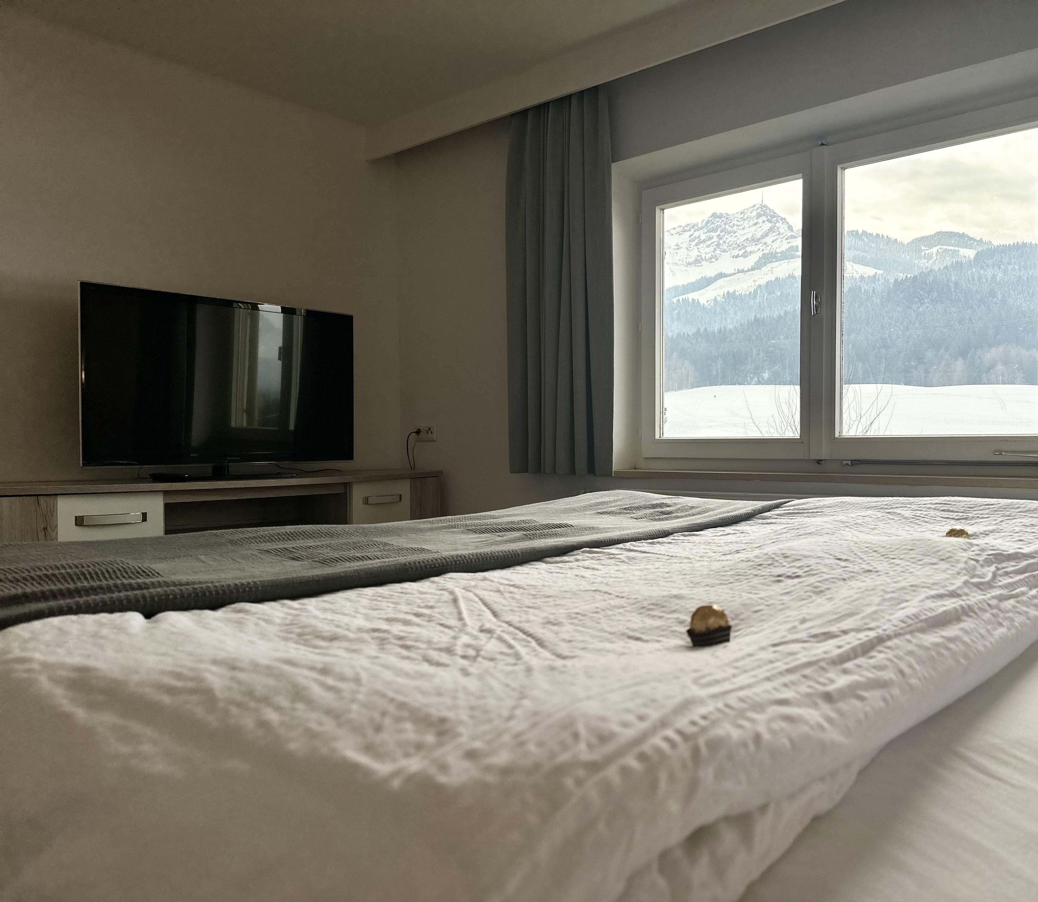 Genießen Sie vom Balkon aus, den einzigartigen Panoramablick auf den Wilden Kaiser, den Kalkstein und das Kitzbüheler Horn. Ein perfekter Moment, die Seele einmal baumeln zu lassen.