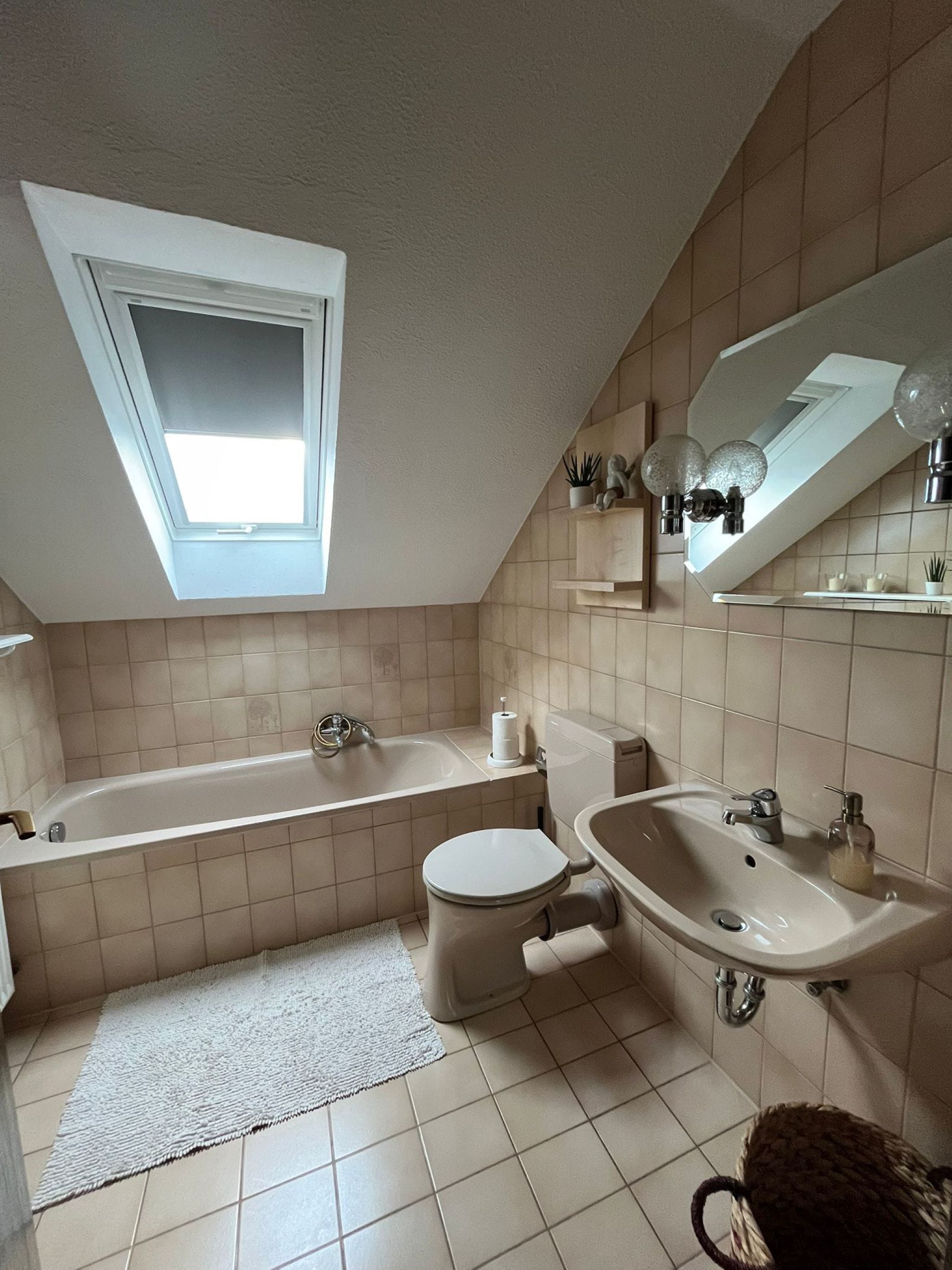 Das Badezimmer verfügt über ein WC, ein Waschbecken und eine Badewanne zum entspannen.