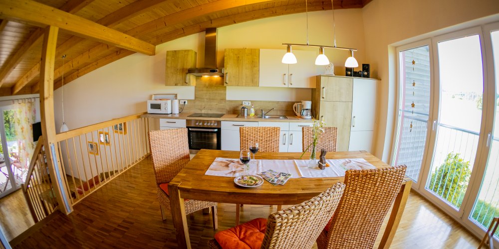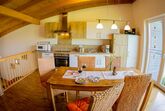 Das Ferienhaus verfügt über einen offenen Wohn-Essbereich mit gut ausgestatteter Küchenzeile, Esstisch mit 5 Stühlen, Ecksofa und TV.