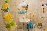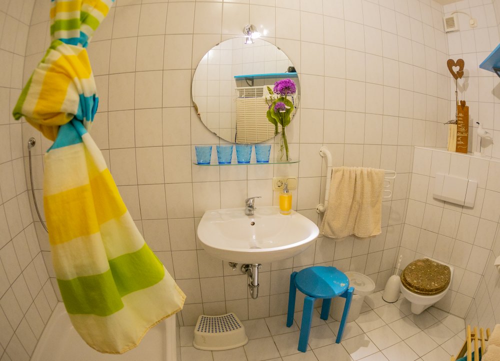 Das Badezimmer ist mit Dusche und WC ausgestattet.