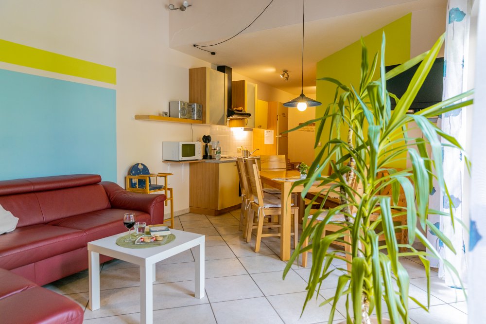 Die Wohnung verfügt über einen offenen Wohn-Essbereich mit gut ausgestatteter Küchenzeile, Esstisch mit 4 Stühlen und Sitzbank, Ecksofa und TV.